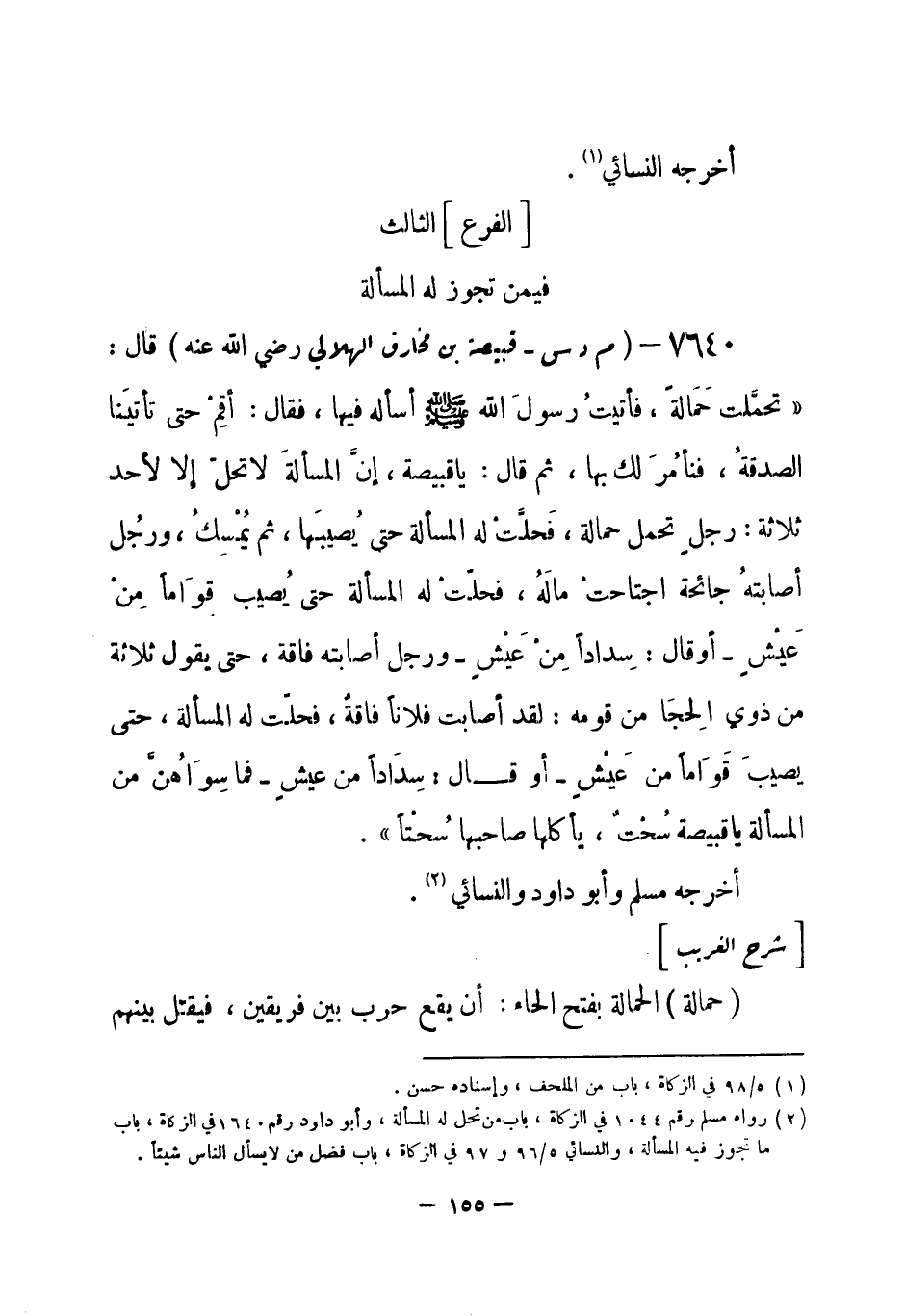 7640 - (م د س) قبيصة بن مخارق الهلالي - رضي الله عنه - قال: «تحمَّلت حَمَالة، فأتيتُ رسول الله - صلى الله عليه وسلم- أسأله فيها، فقال: أقِمْ حتى تأتيَنا الصدقةُ، فنأمُرَ لك بها، ثم قال: يا قبيصة، إنَّ المسألةَ لا تحلّ إلا لأحد ثلاثة: رجلٍ تحمل حمالة، فَحلَّتْ له المسألة حتى يُصيبَها، ثم يُمْسِكُ، ورجُل أصابتهُ جائحة اجتاحت ماله، فحلّتْ له المسألة حتى يُصيب قوَاماً مِنْ عَيْش - أو قال: سِداداً مِنْ عَيْش - ورجل أصابته فاقة، حتى يقول ثلاثة من ذوي الحِجَا من قومه: لقد أصابت فلاناً فاقة، فحلّت له المسألة، حتى يصيبَ قَوَاماً من عَيْش - أو قال: سِدَاداً من عيش - فما سِوَاُهنَّ من المسألة يا قبيصة سُحْت، يأكلها صاحبها سُحْتاً» . أخرجه مسلم وأبو داود والنسائي (¬1) .