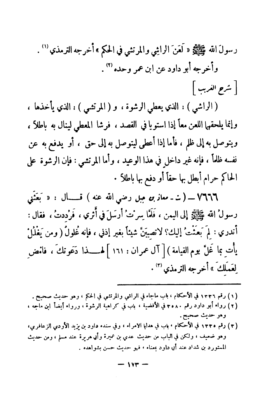 7666 - (ت) معاذ بن جبل - رضي الله عنه - قال: بَعَثَني رسولُ الله - صلى الله عليه وسلم- إِلى اليمن، فَلَمَّا سِرْتُ أرسَلَ في أَثري، فَرُدِدتُ، فقال: أتدري: لِمَ بَعَثْتُ إليك؟ لا تُصِيبَنَّ شيئاً بغير إذني، فإنه غُلول {ومن يَغْلُلْ يَأْتِ بِمَا غَلَّ يومَ القيامة} [آل عمران: 161] لهذا دَعَوتكَ، فامْضِ لِعَمَلِكَ» أخرجه الترمذي (¬1) .