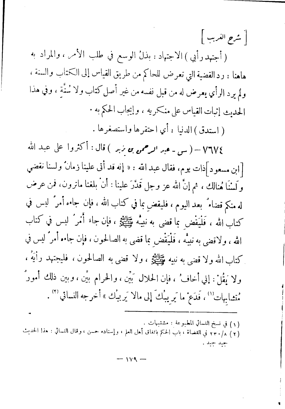 7674 - (س) عبد الرحمن بن يزيد: قال: أكثروا على عبد الله [ابن مسعود] ذات يوم، فقال عبد الله: «إنه قد أتى علينا زمانٌ ولسنا نقضي ولَسْنَا هُنالك، ثم إنَّ الله عز وجل قَدَّرَ علينا: أنْ بلغنا ما ترون، فمن عرض له منكم قضاءٌ بعد اليوم، فليقضِ بما في كتاب الله، فإن جاءه أمرٌ ليس في كتاب الله، فَلْيَقْضِ بما قضى به نبيُّه - صلى الله عليه وسلم-، فإن جاءَ أَمْر ليس في كتاب الله، ولا قضى به نبيُّه، فَلْيَقْضِ بما قضى به الصالحون، فإن جاءه أمرٌ ليس في كتاب الله، ولا قضى به نبيه - صلى الله عليه وسلم-، ولا قضى به الصالحون، فليجتهد رأيَهُ، ولا يَقُلْ: إني أخاف، فإن الحلال بَيِّن، والحرام بيِّن، وبين ذلك أمورٌ مُتشابِهات (¬1) ، فَدَعْ ما يَرِيبُكَ إلى ما لا يَريبُك» أخرجه النسائي (¬2) .