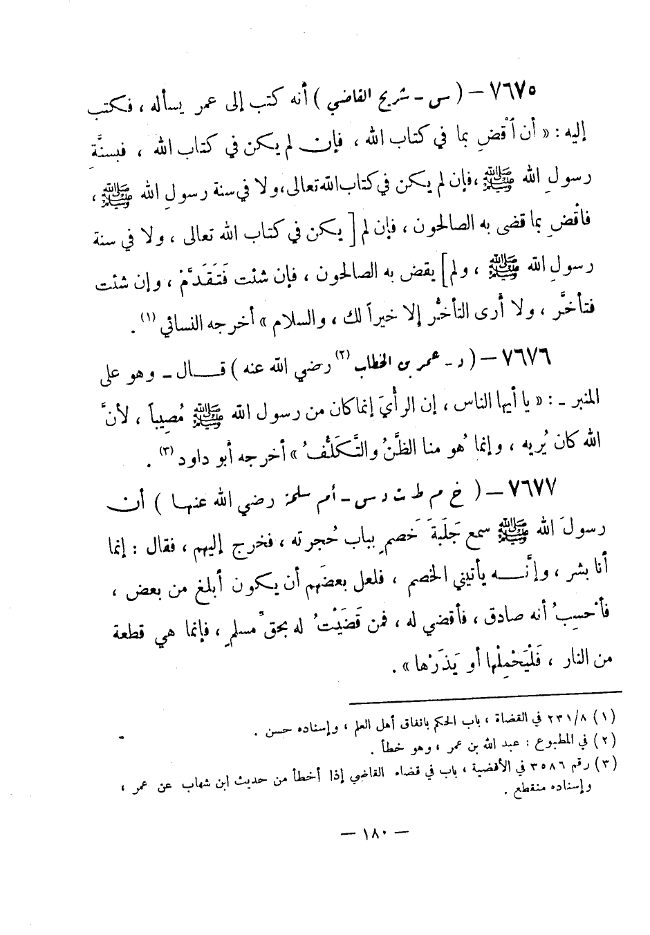 7677 - (خ م ط ت د س) أم سلمة - رضي الله عنها - «أن رسولَ الله - صلى الله عليه وسلم- سمع جَلَبةَ خَصم بباب حُجرته، فخرج إليهم، فقال: إنما أنا بشر، وإنَّه يأتيني الخصم، فلعل بعضَهم أن يكون أبلغ من بعض، فأحْسِبُ أنه صادق، فأقضي له، فمن قَضَيْتُ له بحقِّ مسلم، فإنما هي قطعة من النار، فَلْيَحْمِلْها أو يَذَرْها» . -[181]-