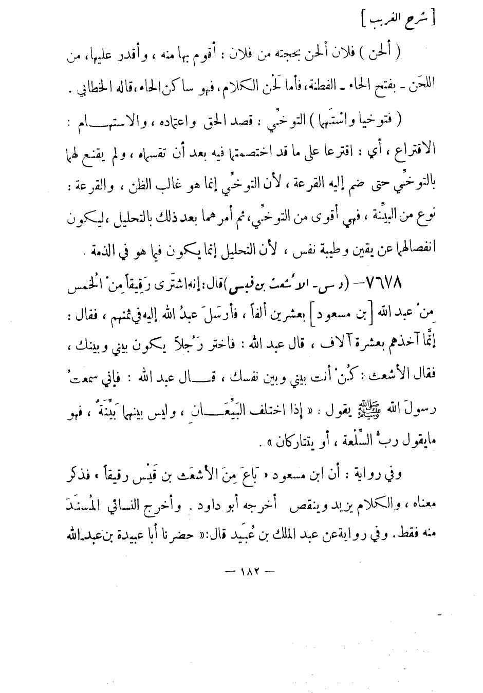 7678 - (د س) الأشعث بن قيس قال: إنه اشتَرى رَقِيقاً مِنْ الخُمس مِنْ عبد الله [بن مسعود] بعشرين ألفاً، فأرسَلَ عبد الله إليه في ثمنهم، فقال: إنَّما آخذهم بعشرة آلاف، قال عبد الله: فاختر رَجُلاً يكون بيني وبينك، فقال الأشعث: كُنْ أنت بيني وبين نفسك، قال عبد الله: فإني سمعتُ رسولَ الله - صلى الله عليه وسلم- يقول: «إِذا اختلف البَيِّعَانِ، وليس بينهما بَيِّنَة، فهو ما يقول رَبُّ السِّلْعة، أو يتتاركان» .