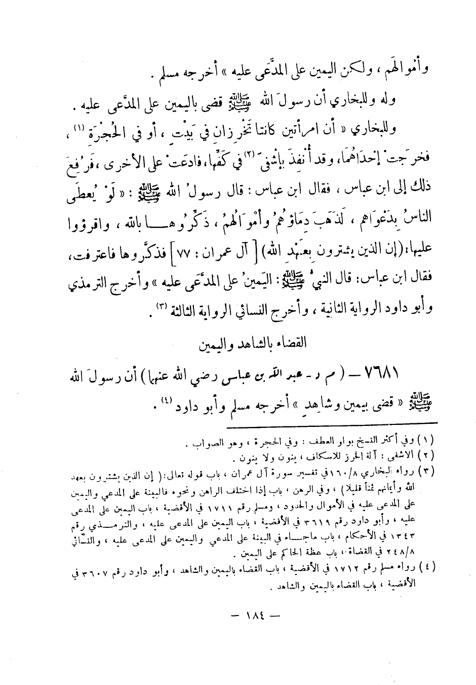 7681 - (م د) عبد الله بن عباس - رضي الله عنهما - أن رسولَ الله - صلى الله عليه وسلم- «قضى بيمين وشاهِد» أخرجه مسلم وأبو داود (¬1) .