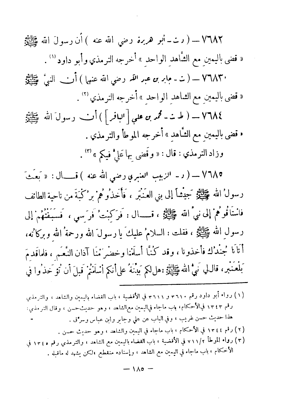 7683 - (ت) جابر بن عبد الله - رضي الله عنهما - أن النبيَّ - صلى الله عليه وسلم- «قضى باليمينِ مع الشاهدِ الواحدِ» أخرجه الترمذي (¬1) .