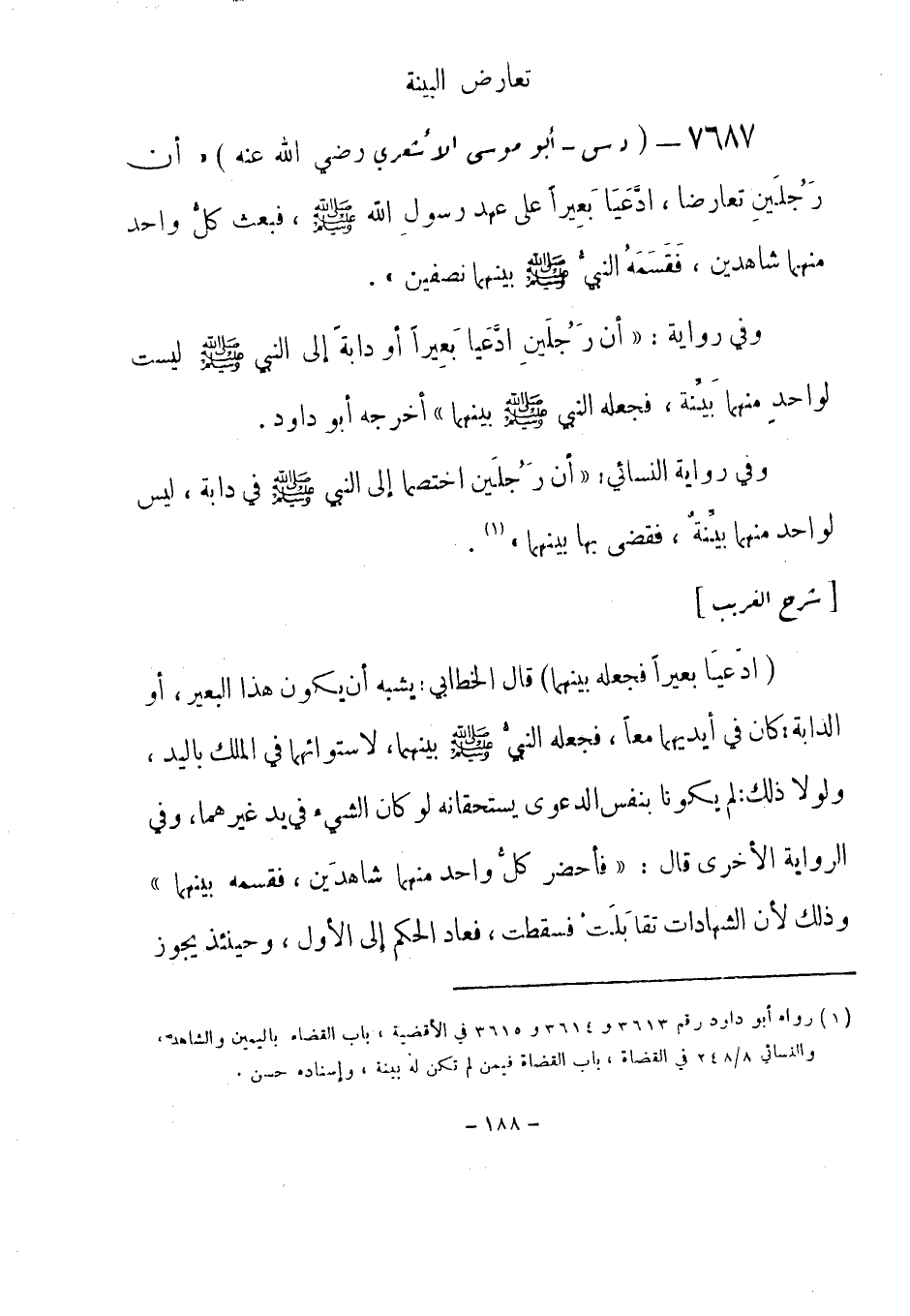 7687 - (د س) أبو موسى الأشعري - رضي الله عنه - «أنّ رَجُلَين تعارضا، وادَّعَيَا بعِيراً على عهد رسول الله - صلى الله عليه وسلم- فبعث كلُّ واحد منهما شاهدين، فَقَسَّمةُ النَّبيُّ - صلى الله عليه وسلم- بينهما نصفين» . وفي رواية: «أن رَجُلَينِ ادَّعَيا بَعِيراً أو دابة إلى النبي - صلى الله عليه وسلم- ليست لواحد منهما بَيِّنة، فجعله النبي - صلى الله عليه وسلم- بينهما» أخرجه أبو داود.