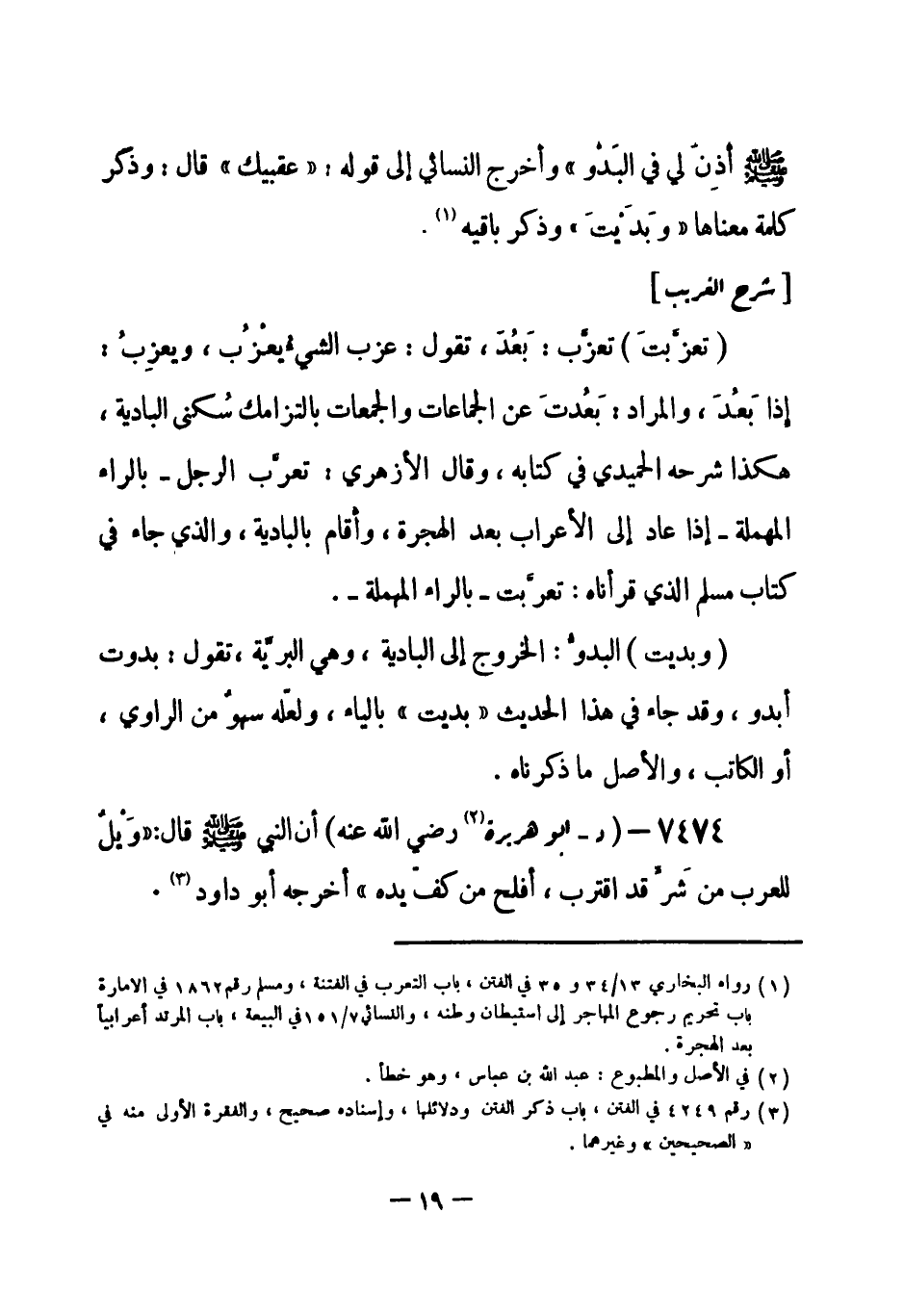 7474 - (د) أبو هريرة (¬1) - رضي الله عنه - أن النبي - صلى الله عليه وسلم- قال: «وَيْل للعرب من شَرٍّ قد اقترب، أفلح من كفّ يده» أخرجه أبو داود (¬2) .