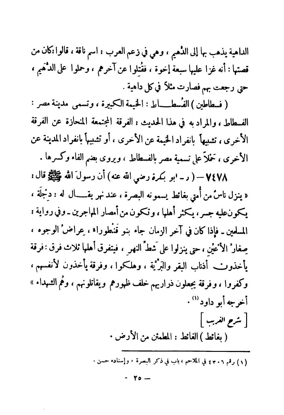 7478 - (د) أبو بكرة - رضي الله عنه - أن رسولَ الله - صلى الله عليه وسلم- قال: «ينزل ناس من أُمتي بغائط يسمونه البصرة، عند نهر يقال له: دِجْلَة، يكون عليه جسر، يكثر أهلها، وتكون من أمصار المهاجرين - وفي رواية: المسلمين - فإِذا كان في آخر الزمان جاء بنو قَنْطوراءَ، عِراضُ الوجوه، صِغارُ الأعيُنِ، حتى ينزلوا على شَطِّ النهرِ، فيتفرق أهلها ثلاث فرق: فرقة يأخذون أذناب البقر والبَرِّيَّة، وهلكوا، وفرقة يأخذون لأنفسهم، وكفروا، وفرقة يجعلون ذراريهم خلف ظهورهم ويقاتلونهم، وهُم الشهداء» أخرجه أبو داود (¬1) .