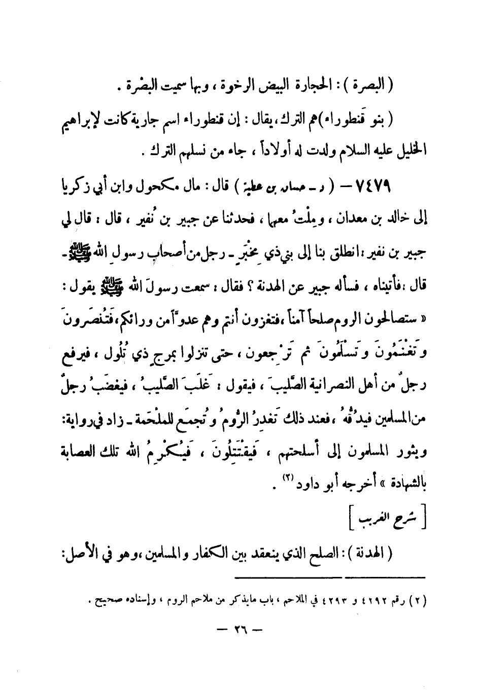 7479 - (د) حسان بن عطية قال: مال مكحول وابن أبي زكريا إلى خالد بن معدان، ومِلْتُ معهما، فحدثنا عن جبير بن نُفير، قال: قال لي جبير بن نفير: انطلق بنا إلى بني ذي مِخْبَرٍ - رجل من أصحاب رسول الله - صلى الله عليه وسلم- قال: فأتيناه، فسأله جبير عن الهدنة؟ فقال: سمعت رسول الله - صلى الله عليه وسلم- يقول: «ستصالحون الروم صلحاً آمناً، فتغزون أنتم وهم عدوَّاً من ورائكم، فَتُنصَرونَ وتَغْنَمُونَ وتَسْلَمُونَ ثم تَرْجِعون، حتى تنزلوا بمرجٍ ذي تُلُول، فيرفع رجلٌ من أهل النصرانية الصَّليبَ، فيقول: غَلَبَ الصَّليب، فيغضَبُ رجلٌ من المسلمين فيدُقُّهُ، فعند ذلك تَغدِرُ الرُّوم وتُجمَع للملْحَمة - زاد في رواية: ويثور المسلمون إلى أسلحتهم، فَيقْتَتِلُون، فَيُكْرِمُ الله تلك العصابة بالشهادة» أخرجه أبو داود (¬1) .