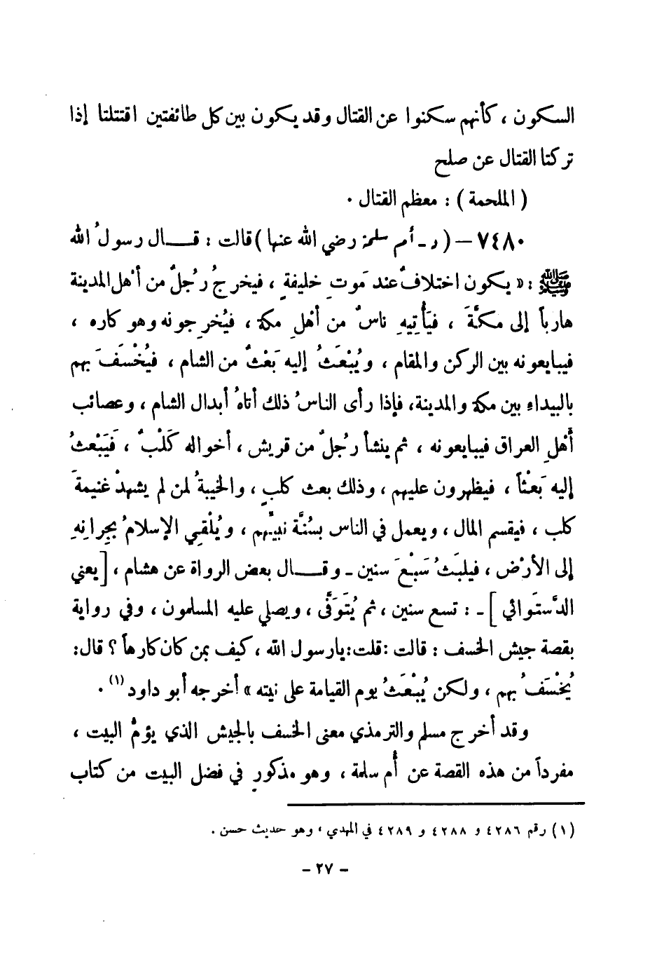 7480 - (د) أم سلمة - رضي الله عنها - قالت: قال رسول الله - صلى الله عليه وسلم-: «يكون اختلاف عند مَوتِ خليفة، فيخرجُ رجل من أهل المدينة هارباً إلى مكَّةَ، فيَأُتِيهِ ناس من أهلِ مكة، فيُخرِجونه وهو كاره، فيبايعونه بين الركن والمقام، ويُبْعَثُ إليه بَعْث من الشام، فيُخْسَفَ بهم بالبيداءِ بين مكة والمدينة، فإذا رأى الناسُ ذلك أتاهُ أبدال الشام، وعصائب أهْلِ العراق فيبايعونه، ثم ينشأ رجل من قريش، أخواله كَلْب، فيَبْعثُ إليه بَعْثاً، فيظهرون عليهم، وذلك بعث كلب، والخيبةُ لمن لم يشهدْ غنيمةَ كلب، فيقسم المال، ويعمل في الناس بسُنَّة نبيِّهم، ويُلْقِي الإسلامُ بجِرانِهِ إلى الأَرْض، فيلبَثُ سَبْعَ سنين - وقال بعض الرواة عن هشام، [يعني الدَّستَوائي]-: تسع سنين، ثم يُتَوَفَّى، ويصلي عليه المسلمون، وفي رواية بقصة جيش الخسف قالت: قلت: يا رسول الله، كيف بمن كان كارهاً؟ قال: يُخْسَفُ بهم، ولكن يُبْعَثُ يوم القيامة على نيته» أخرجه أبو داود (¬1) .