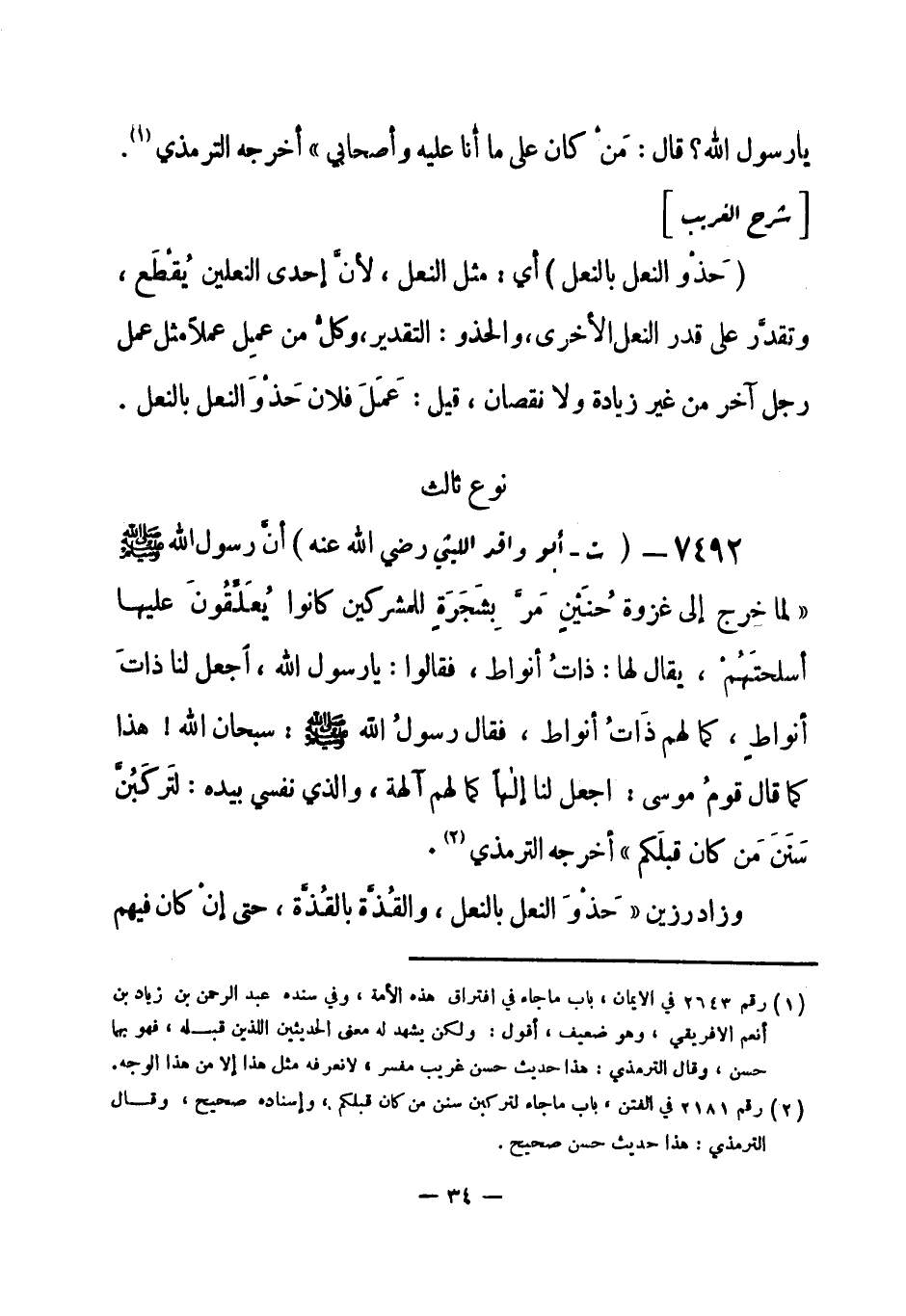 7492 - (ت) أبو واقد الليثي - رضي الله عنه - أنَّ رسول الله - صلى الله عليه وسلم- «لما خرج إلى غزوة حُنَيْن مَرَّ بِشَجَرَة للمشركين كانوا يُعَلِّقُونَ عليها أسلحتَهُمْ، يقال لها: ذاتُ أنواط، فقالوا: يا رسول الله، اجعل لنا ذاتَ أنواطٍ، كما لهم ذَاتُ أنواط، فقال رسولُ الله - صلى الله عليه وسلم-: سبحان الله! هذا كما قال قومُ موسى: اجعل لنا إلهاً كما لهم آلهة، والذي نفسي بيده: لَتركَبُنَّ سَنَنَ من كان قبلَكم» أخرجه الترمذي (¬1) .