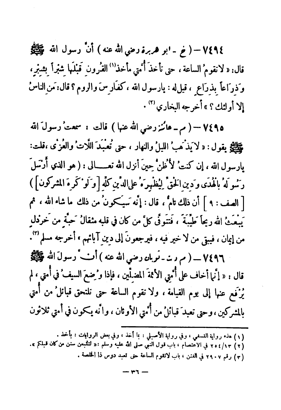 7494 - (خ) أبو هريرة - رضي الله عنه - أنَّ رسول الله - صلى الله عليه وسلم- قال: «لا تقومُ الساعة حتى تأخذَ أُمَّتي مأخذ (¬1) القُرونِ قَبْلَها شِبْراً بِشِبر، وَذِرَاعاً بِذِرَاع، قيل له: يا رسول الله، كفَارِسَ والروم؟ قال: مَنِ الناسُ إلا أولئك؟» أخرجه البخاري (¬2) .