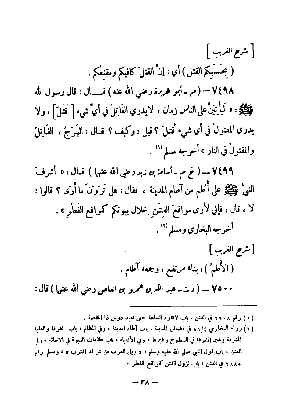 7499 - (خ م) أسامة بن زيد - رضي الله عنهما -: قال: «أشرفَ النبيُّ - صلى الله عليه وسلم- على أُطُم من آطام المدينة، فقال: هل تَرَوْنَ ما أرَى؟ قالوا: لا، قال: فإني لأرى مواقعَ الفِتنِ خِلال بيوتكم كمواقع القَطْرِ» . أخرجه البخاري ومسلم (¬1) .