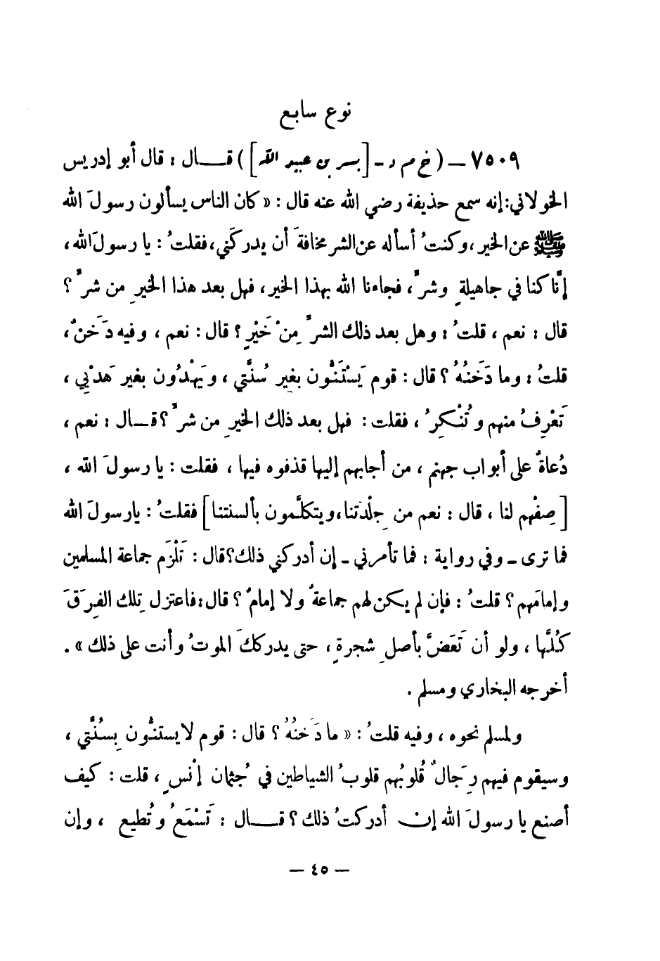 7509 - (خ م د) [بسر بن عبيد الله] قال: قال أَبو إدريس الخولاني: إنه سمع حذيفة - رضي الله عنه - قال: «كان الناس يسألون رسولَ الله - صلى الله عليه وسلم- عن الخير، وكنتُ أسأله عن الشر مخافةَ أن يدركَني، فقلتُ: يا رسولَ الله، إنَّا كنا في جاهليةِ وشرِّ، فجاءنا الله بهذا الخير، فهل بعد هذا الخيرِ من شرِّ؟ قال: نعم، قلتُ: وهل بعد ذلك الشر من خير؟ قال: نعم، وفيه دَخَن، قلت: وما دخنه؟ قال: قوم يَستَنُّون بغير سُنَّتي، وَيهدُون بغير هَدْيي، تَعْرِفُ منهم وتُنْكِرُ، فقلت: فهل بعد ذلك الخيرِ من شرِّ؟ قال: نعم، دُعاة على أبواب جهنم، من أجابهم إليها قذفوه فيها، فقلت: يا رسول الله، [صِفْهم لنا، قال: نعم من جِلْدتنا، ويتكلَّمون بألسنتنا] فقلتُ: يا رسول الله، فما ترى - وفي رواية: فما تأمرني - إن أدركني ذلك؟ قال: تَلْزَم جماعة المسلمين وإمامَهم، قلتُ: فإن لم يكن لهم جماعةُ ولا إمام؟ قال: فاعتزل تِلك الفِرَقَ كُلَّها، ولو أن تَعَضَّ بأصلِ شجرة، حتى يدرككَ الموتُ وأنت على ذلك» . أخرجه البخاري ومسلم.