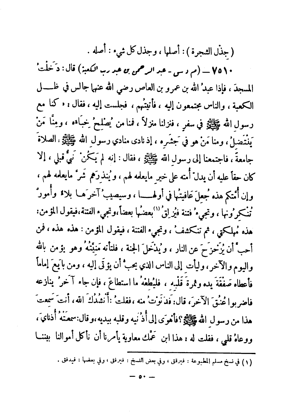 7510 - (م د س) عبد الرحمن بن عبد رب الكعبة قال: دَخَلْتُ المسجدَ، فإذا عبد الله بن عمرو بن العاص - رضي الله عنهما - جالس في ظل الكعبة، والناس مجتمعون إليه، فأتيتُهم، فجلست إليه، فقال: «كنا مع رسول الله - صلى الله عليه وسلم- في سفر، فنزلنا منزلاً، فمنا من يُصْلِحُ خِبَاءه، ومِنَّا مَنْ يَنْتَضِلُ، ومنا مَنْ هو في جَشَرِه، إذ نادى منادي رسول الله - صلى الله عليه وسلم- الصلاة جامعة، فاجتمعنا إلى رسول الله - صلى الله عليه وسلم-، فقال: إنه لم يَكُنْ نَبيّ قبلي، إلا كان حقاً عليه أن يدلّ أُمته على خير ما يعلمه لهم، ويُنذِرَهم شَرَّ ما يعلمه لهم، وإن أُمَّتكم هذه جُعِلَ عَافيتُها في أولها، وسيصيبُ آخرَها بلاء وأُمور تُنْكِرُونها، وتجيءُ فتنة فيُزِلقُ (¬1) بعضُها بعضاً، وتجيء الفتنة، فيقول المؤمن: هذه مُهلكتي، ثم تنكشفُ، وتجيء الفتنة، فيقول المؤمن: هذه هذه، فمن أحبَّ أن يُزَحْزَحَ عن النار، ويُدْخل الجنة، فلتأته مَنِيَّتُهُ وهو مؤمن بالله واليوم الآخر، وليأت إلى الناس الذي يحبُّ أن يؤتَى إليه، ومن بايَعَ إماماً فأعطاه صَفْقَةَ يده وثمرة قَلْبِهِ، فليُطِعْهُ ما استطاعَ، فإن جاء آخَرُ ينازعه فاضربوا عُنُقَ الآخرَ، قال: فَدَنَوْتُ منه، فقلتُ: أَنْشُدُكَ الله، أنتَ سَمِعتَ هذا من رسول الله - صلى الله عليه وسلم-؟ فأهْوَى إلى أُذُنَيه وقلبه بيديه، وقال: سمعَتْهُ أُذنايَ، ووعاهُ قلبي، فقلت له: هذا ابن عَمِّك معاوية يأمرنا أن نأكل أموالنا بيننا -[51]- بالباطل، ونقتل أنفسنا، والله تعالى يقول: {يا أيُّها الذين آمنوا لا تأكلوا أموالَكم بينكم بالباطلِ إلاَّ أن تكونَ تجارةً عن تَرَاضٍ مِنكم ولا تقتلوا أنفسَكم إنَّ الله كان بكم رحيماً} [النساء: 29] فسَكَتَ عني ساعة، ثم قال: أَطِعهُ في طاعة الله، واعصِه في معصية الله» أخرجه مسلم.
