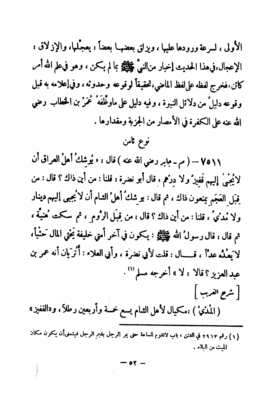7511 - (م) جابر - رضي الله عنه - قال: «يُوشِكُ أهلُ العراق أن لا يُجبى إِليهم قَفِيز ولا دِرْهم، قال أبو نضرة: قلنا: من أين ذاك؟ قال: من قِبَلِ العَجَمِ يمنعون ذاك، ثم قال: يوشِكُ أهلُ الشام أن لا يُجبى إليهم دينار ولا مُدْي، قلنا: من أين ذاك؟ قال: من قِبَلِ الرُّومِ، ثم سكت هُنيَّة، ثم قال: قال رسولُ الله - صلى الله عليه وسلم-: يكون في آخر أمتي خليفة يَحْثي المال حَثْياً، لا يَعُدُّه عدّاً، قال: قلتُ لأبي نضرة، وأبي العلاء: أَتُرَيان أنه عمر بن عبد العزيز؟ قالا: لا» أخرجه مسلم (¬1) .