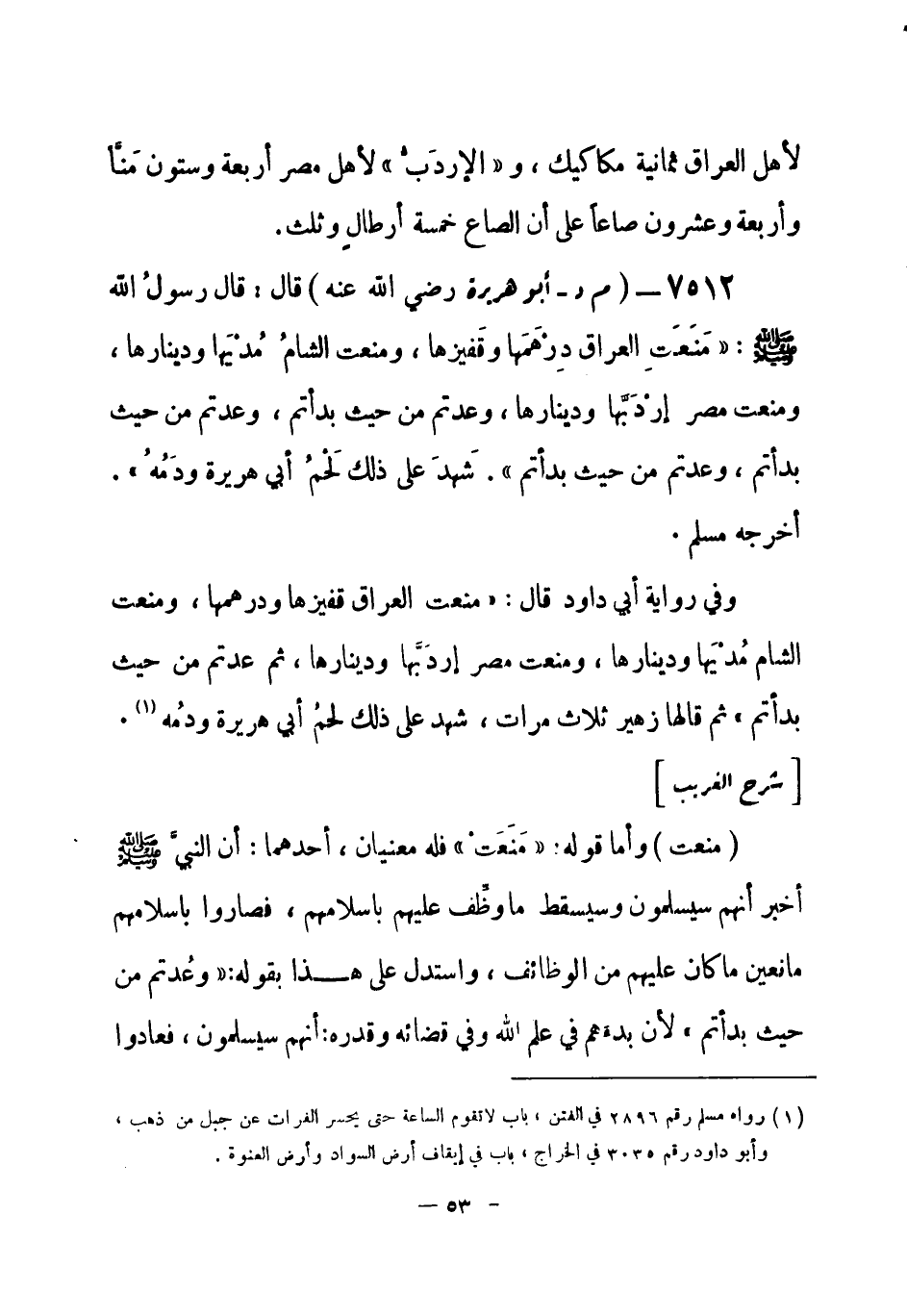 7512 - (م د) أبو هريرة - رضي الله عنه - قال: قال رسولُ الله - صلى الله عليه وسلم-: «مَنَعَتِ العراق دِرْهَمَها وقَفيزها، ومنعت الشامُ مُدْيهَا ودينارها، ومنعت مصر إِرْدَبَّها ودينارها، وعدتم من حيث بدأتم، وعدتم من حيث بدأتم، وعدتم من حيث بدأتم» . شَهدَ على ذلك لَحْمُ أبي هريرة ودَمُهُ. أخرجه مسلم.