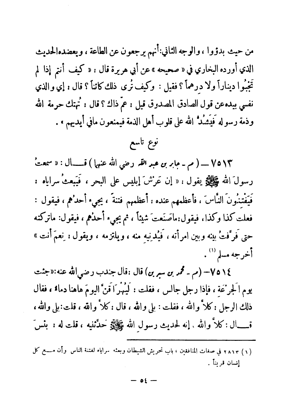 7514 - (م) محمد بن سيرين قال: قال جندب - رضي الله عنه -: «جئت يوم الجَرْعَةِ، فإذا رجل جالس، فقلت: لَيُهْرَاقَنَّ اليومَ هاهنا دماء، فقال ذلك الرجل: كلا والله، فقلت: بلى والله، قال: كلا والله، قلت: بلى والله، قال: كلا والله، إنه لحديث رسولِ الله - صلى الله عليه وسلم- حَدَّثنيه، قلت له: بئسَ -[55]- الجليسُ لي أَنت منذُ اليوم، تسمعني أحالفك (¬1) ، وقد سمعته من رسولِ الله - صلى الله عليه وسلم-، فلا تنهاني، ثم قلت: ما هذا الغضب؟ فأقبلتُ عليه وأسأله، فإذا الرجل حُذَيفة» أخرجه مسلم (¬2) .