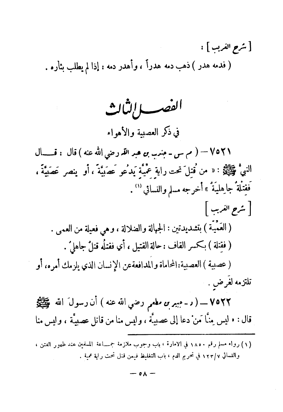 7522 - (د) جبير بن مطعم - رضي الله عنه - أن رسولَ الله - صلى الله عليه وسلم- قال: «ليس مِنَّا مَنْ دعا إلى عصبيَّة، وليس منا من قاتل عصبيَّة، وليس منا -[59]- من مات على عصبيَّة» أخرجه أبو داود (¬1) .