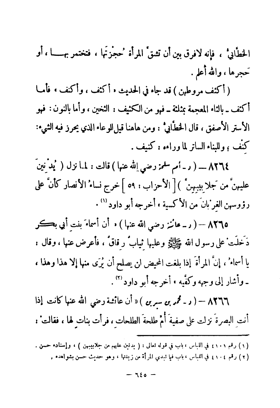 8265 - (د) عائشة - رضي الله عنها - «أن أسماءَ بنتِ أبي بكر دَخلْتَ على رسول الله - صلى الله عليه وسلم- وعليها ثياب رقاق، فأعرض عنها، وقال: يا أسماءُ، إنَّ المرأةَ إذا بلغت المحيض لن يصلح أن يُرَى منها إلا هذا وهذا، - وأشار إلى وجهه وكفَّيه» أخرجه أبو داود (¬1) .