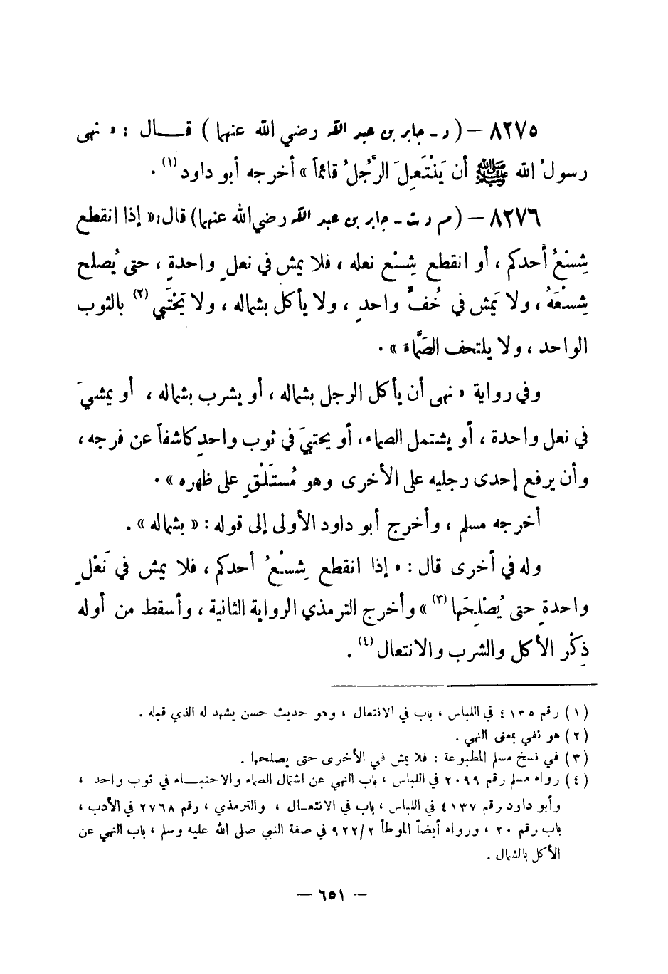 8275 - (د) جابر بن عبد الله - رضي الله عنهما - قال: «نهى رسولُ الله - صلى الله عليه وسلم- أن يَنْتَعِلَ الرَّجُلُ قائماً» أخرجه أبو داود (¬1) .