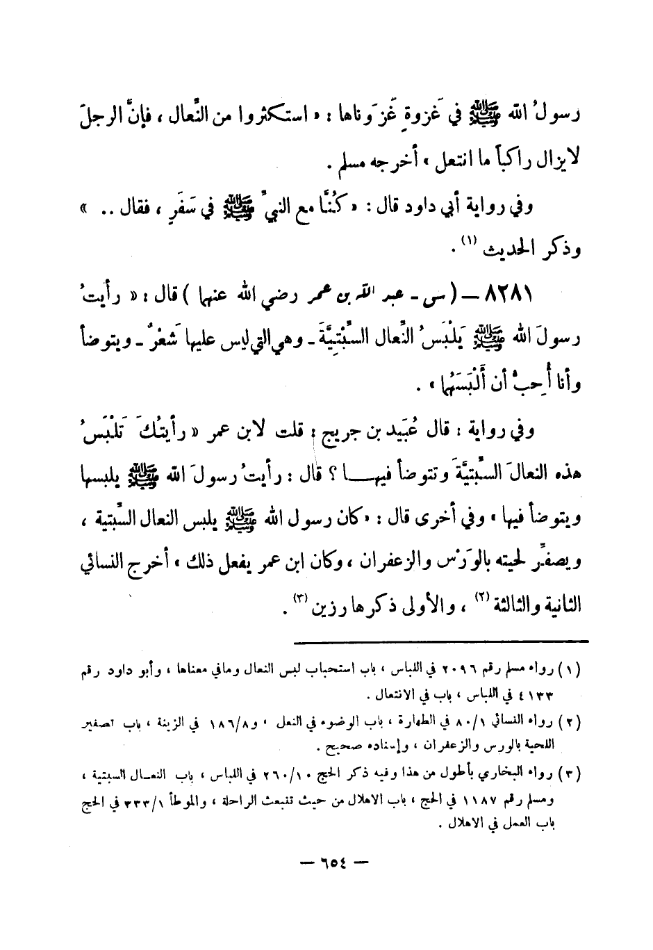 8281 - (س) عبد الله بن عمر - رضي الله عنهما - قال: «رأيتُ رسولَ الله - صلى الله عليه وسلم- يَلْبِسُ النِّعال السِّبْتِيَّةَ - وهي التي ليس عليها شَعْر - ويتوضأ وأنا أُحِبُّ أن أَلْبَسَهُما» .