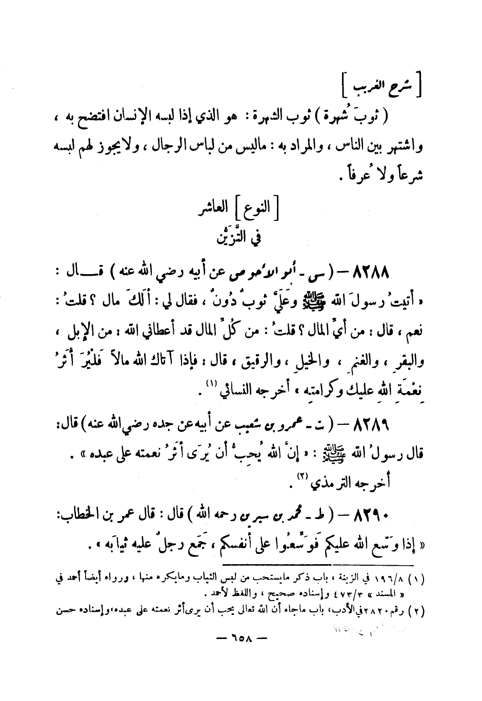 8289 - (ت) عمرو بن شعيب عن أبيه عن جده - رضي الله عنه - قال: «قال رسولُ الله - صلى الله عليه وسلم-: إنَّ الله يُحِبُّ أن يُرَى أثرُه نعمته على عبده» . أخرجه الترمذي (¬1) .