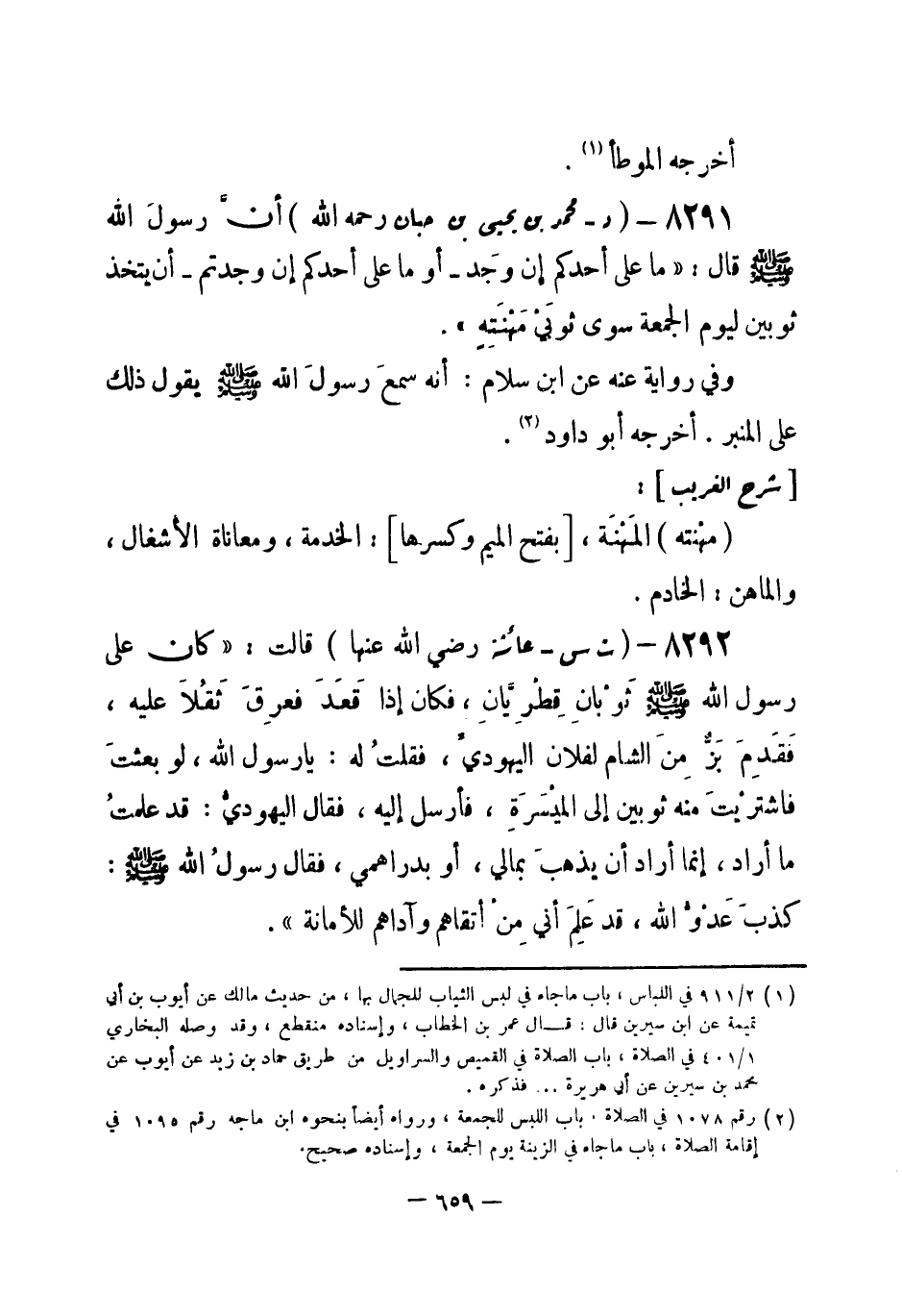 8291 - (د) محمد بن يحيى بن حبان - رحمه الله - أنَّ رسولَ الله - صلى الله عليه وسلم- قال: «ما على أحدكم إن وَجد - أو ما على أحدكم إن وجدتم - أن يتخذ ثوبين ليوم الجمعة سوى ثَوبَيْ مَهْنتِهِ» .