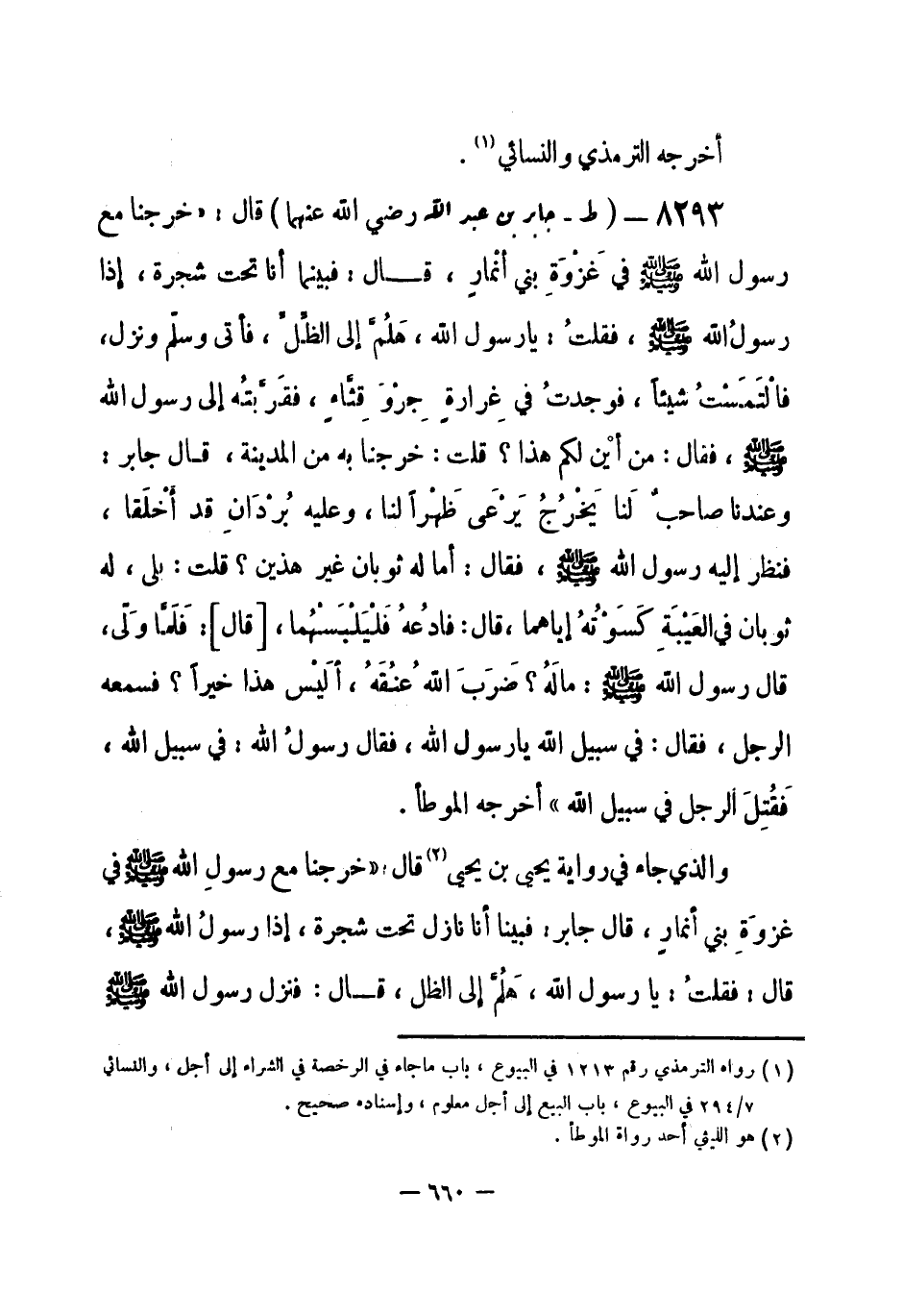 8293 - (ط) جابر بن عبد الله - رضي الله عنهما - قال: «خرجنا مع رسول الله - صلى الله عليه وسلم- في غزْوَةِ بني أنْمار، قال: فبينما أنا تحت شجرة، إذا رسولُ الله - صلى الله عليه وسلم-، فقلتُ: يا رسولَ الله، هلُمَّ إلى الظِّلِّ، فأتى وسلّم ونزل، فالتَمَسْتُ شيئاً، فوجدتُ في غِرارةٍ جِرْوَ قِثَّاء، فقرَّبتُه إلى رسول الله - صلى الله عليه وسلم-، فقال: مِن أيْن لكم هذا؟ قلت: خرجنا به من المدينة، قال جابر: وعندنا صاحب لَنا يخْرُجُ يرْعَى ظَهْراً لنا، وعليه بُرْدانِ قد أخْلَقا، فنظر إليه رسول الله - صلى الله عليه وسلم-، فقال: أما له ثوبان غير هذين؟ قلت: بلى، له ثوبان في العَيْبَةِ كسَوتُهُ إياهما، قال: فادُعهُ فليلْبَسْهُما، [قال] : فلمَّا ولَّى، قال رسول الله - صلى الله عليه وسلم-: مالَهُ؟ ضربَ الله عنُقَهُ، أليْس هذا خيراً؟ فسمعه الرجل، فقال: في سبيل الله يا رسول الله، فقال رسول الله: في سبيل الله، فَقُتِلَ الرجل في سبيل الله» أخرجه الموطأ.