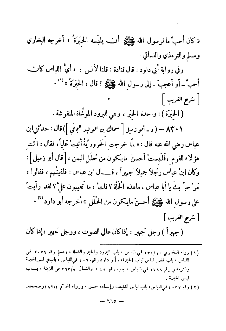 8301 - (د) أبو زميل [سماك بن الوليد اليماني] قال: حدَّثني ابن عباس - رضي الله عنه - قال: «لمّا خرجتِ الحروريَّةُ أتيتُ عَلِياً، فقال: ائتِ هؤلاء القومِ، فَلَبِستُ أحسنَ ما يكون من حُلَلِ اليمن، [قال أبو زميل] : وكان ابنُ عباس رُجلاً جميلاً جهيراً، قال ابن عباس: فلقيتُهم، فقالوا: مرحباً بكَ يا أبا عباس، ما هذه الحُلَّة؟ قلتُ: ما تعيبون عليَّ؟ لقد رأيتُ على رسولِ الله - صلى الله عليه وسلم- أحسنَ ما يكون من الحُلَل» أخرجه أبو داود (¬1) .