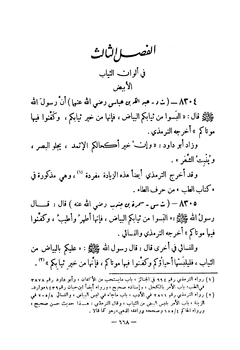 8304 - (ت د) عبد الله بن عباس - رضي الله عنهما - أنَّ رسولَ الله - صلى الله عليه وسلم- قال: «البَسوا من ثيابكم البياض، فإنها من خير ثيابكم، وكفِّنوا فيها موتاكم» أخرجه الترمذي.