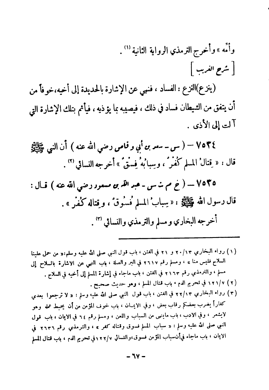 (¬1) رواه البخاري 13 / 22 في الفتن، باب قول النبي صلى الله عليه وسلم: " لا ترجعوا بعدي كفاراً يضرب بعضكم رقاب بعض "، وفي الإيمان، باب خوف المؤمن من أن يحبط عمله وهو لا يشعر، وفي الأدب، باب ما ينهى من السباب واللعن، ومسلم رقم (64) في الإيمان، باب قول النبي صلى الله عليه وسلم: " سباب المسلم فسوق وقتاله كفر "، والترمذي رقم (2636) في الإيمان، باب ما جاء في أن سباب المؤمن فسوق، والنسائي 7 / 122 في تحريم الدم، باب قتال المسلم.