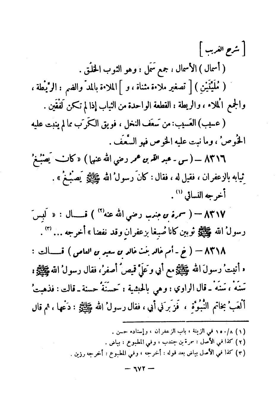 8317 - () سمرة بن جندب - رضي الله عنه - (¬1) قال: «لَبِسَ رسولُ الله - صلى الله عليه وسلم- ثوبين كانا صُبِغا بزعفران وقد نفضا» أخرجه ... (¬2) .