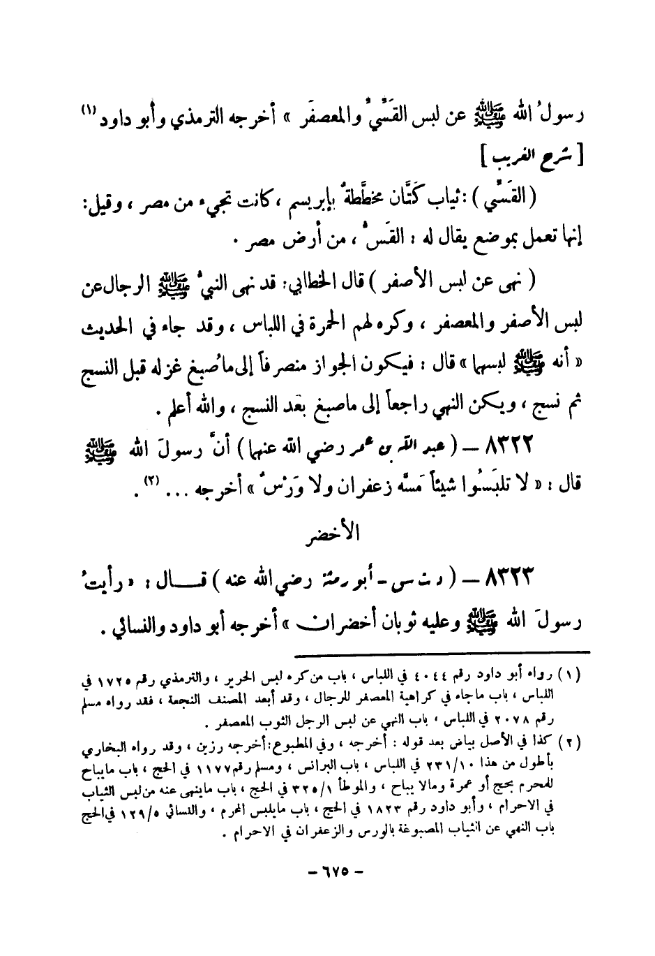 8322 - () عبد الله بن عمر - رضي الله عنهما- أن رسول الله - صلى الله عليه وسلم- قال: «لا تلبسوا شيئاً مسه زعفزان ولا ورس» أخرجه ... (¬1) .