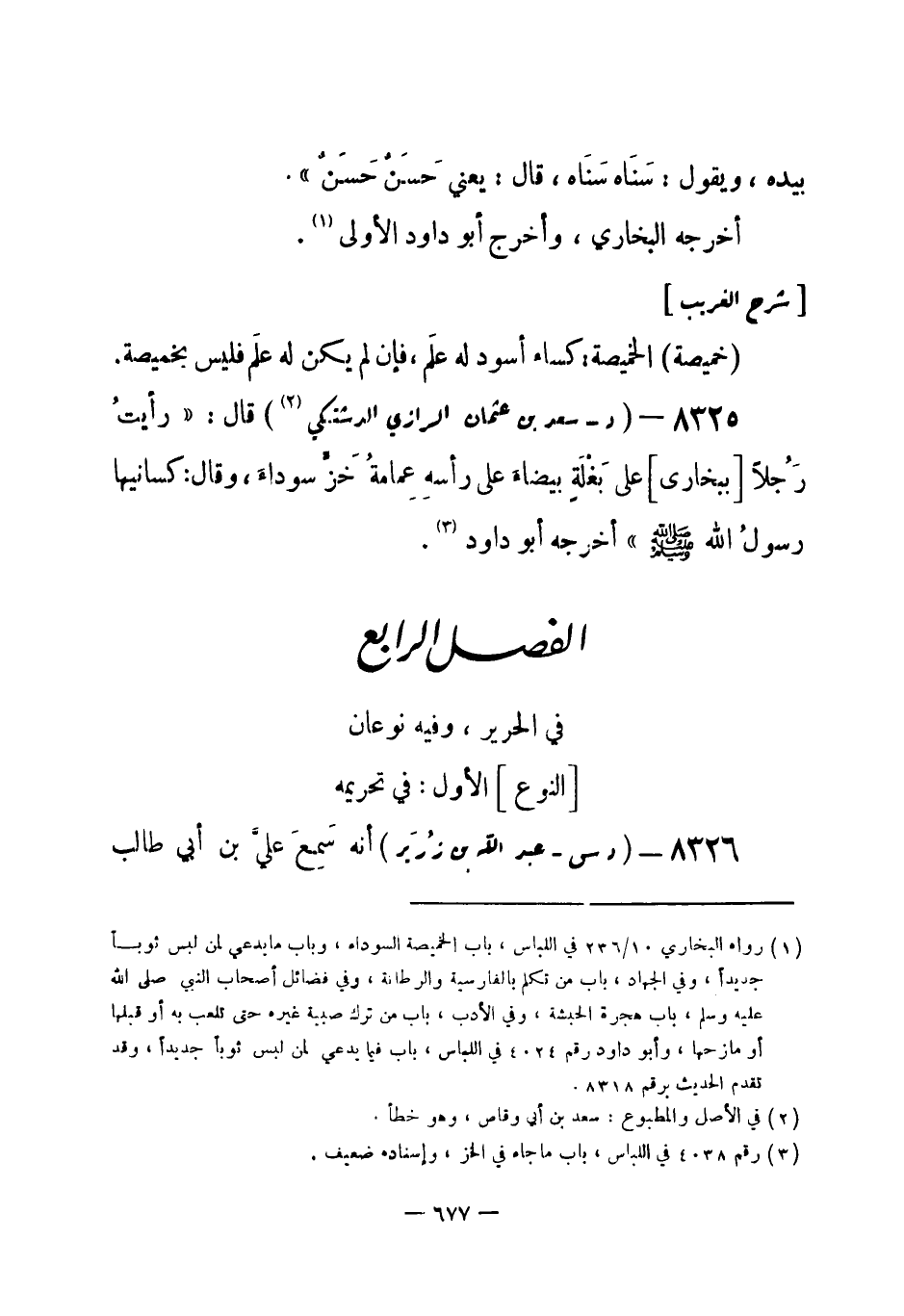 8326 - (د س) عبد الله بن زُرَير أنه سَمِعَ عليَّ بن أبي طالب -[678]- يقول: «رأيتُ رسولَ الله - صلى الله عليه وسلم- أخذ حريراً، فجعله في يمينه، وذهباً فجعله في شماله، ثم قال: إنَّ هذين حرام على ذُكورِ أُمَّتي» . أخرجه أبو داود والنسائي (¬1) .