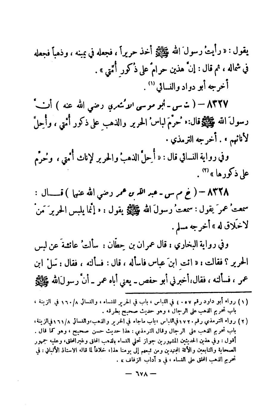 8327 - (ت س) أبو موسى الأشعري - رضي الله عنه - أنَّ رسول الله - صلى الله عليه وسلم- قال: «حُرِّم لباس الحرير والذهب على ذكور أمِّتي، وأُحِلَّ لأناثهم» . أخرجه الترمذي.