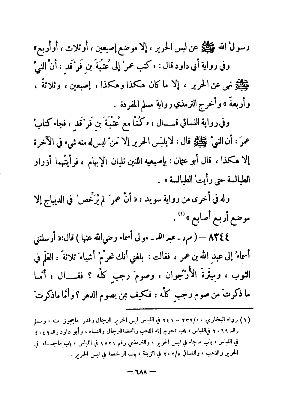 (¬2) رواه مسلم رقم (2069) في اللباس، باب تحريم استعمال إناء الذهب والفضة للرجال والنساء، وأبو داود رقم (4054) في اللباس، باب الرخصة في العلم وخيط الحرير.