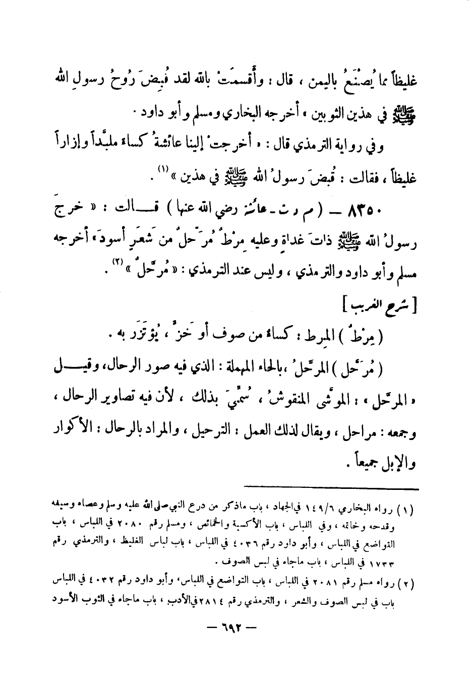 8350 - (م د ت) عائشة - رضي الله عنها - قالت: «خرجَ رسولُ الله - صلى الله عليه وسلم- ذات غداة وعليه مِرْط مُرَحَّل من شَعَرٍ أسودَ» أخرجه مسلم وأبو داود والترمذي، وليس عند الترمذي: «مُرَحَّل» (¬1) .