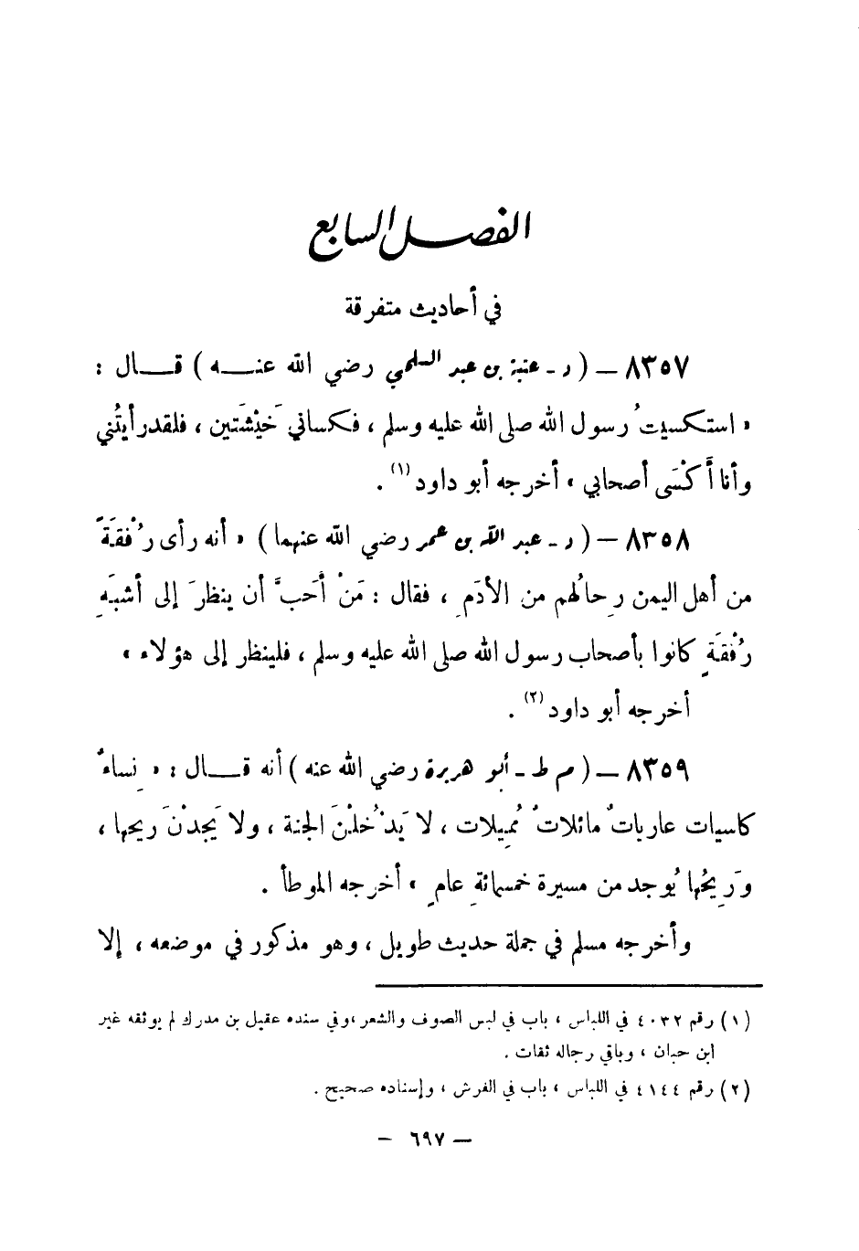 8359 - (م ط) أبو هريرة - رضي الله عنه - أنه قال: «نِساء كاسيات عاريات مائلات مُميِلات، لا يدْخُلْنَ الجنة، ولا يجْدنَ ريحها، ورِيحُها يوجد من مسيرة خمسمائة عام» أخرجه الموطأ.
