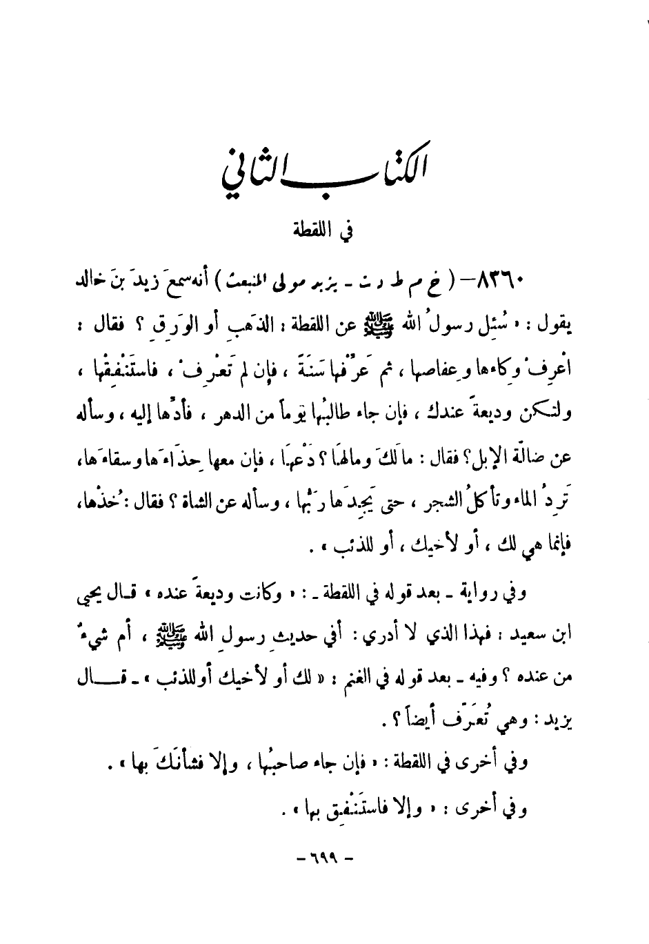 8360 - (خ م ط د ت) يزيد مولى المنبعث أنه سمع زيدَ بنَ خالد يقول: «سُئِل رسولُ الله - صلى الله عليه وسلم- عن اللقطة: الذَهبِ أو الوَرِقِ؟ فقال: اعرِفْ وكاءها وعِفاصها، ثم عرِّفها سنة، فإن لم تَعْرِفْ، فاستنْفِقْها، ولتكن وديعة عندك، فإن جاء طالبُها يوماً من الدهر، فأدِّها إليه، وسأله عن ضالة الإبل؟ فقال: ما لَكَ وما لها؟ دَعْها، فإن معها حِذَاءها وسقاءها، تَرِدُ الماء وتأكلُ الشجر، حتى يَجِدَها ربُّها، وسأله عن الشاة؟ فقال: خُذْها، فإنما هي لك، أو لأخيك، أو للذئب» .