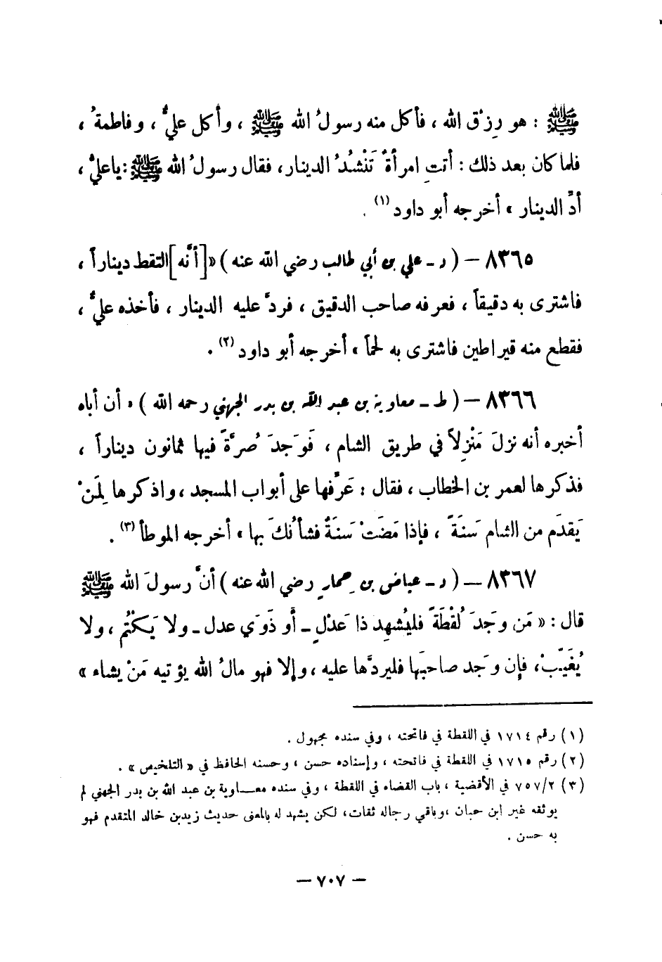 8365 - (د) علي بن أبي طالب - رضي الله عنه - « [أنَّه] التقط ديناراً، فاشترى به دقيقاً، فعرفه صاحب الدقيق، فردَّ عليه الدينار، فأخذه عليٌّ، فقطع منه قيراطين فاشترى به لحماً» أخرجه أبو داود (¬1) .