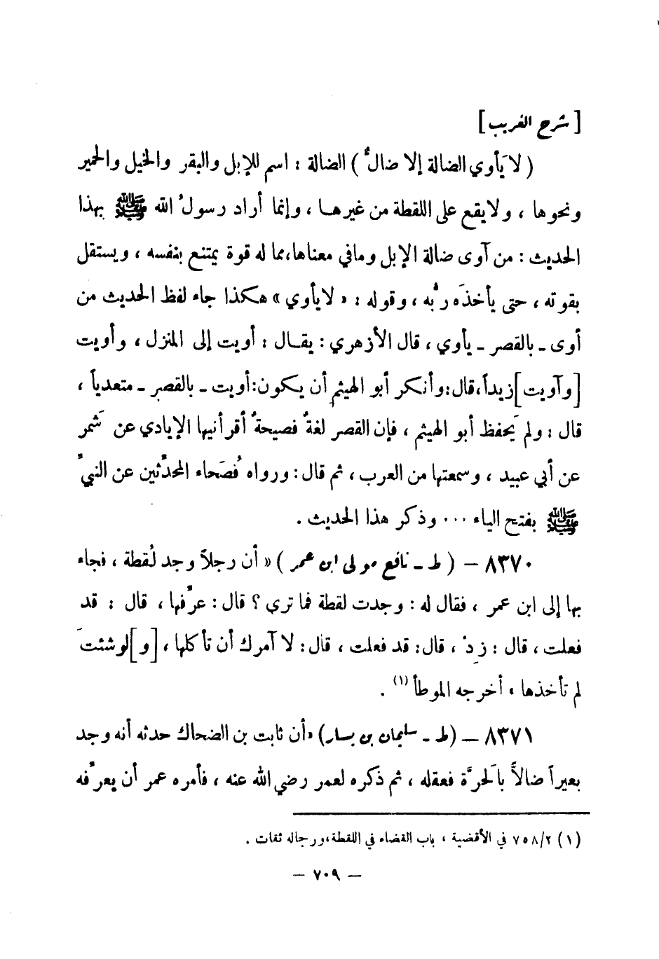 8371 - (ط) سليمان بن يسار «أن ثابت بن الضحاك حدثه أنه وجد بعيراً ضالاً بالحَرَّة فعقله، ثم ذكره لعمر - رضي الله عنه - فأمره عمر أن يعرِّفه -[710]- ثلاث مرات، فقال له ثابت: قد شغلني عن ضيعتي، قال، أرسله حيث وجدتَه» أخرجه الموطأ (¬1) .