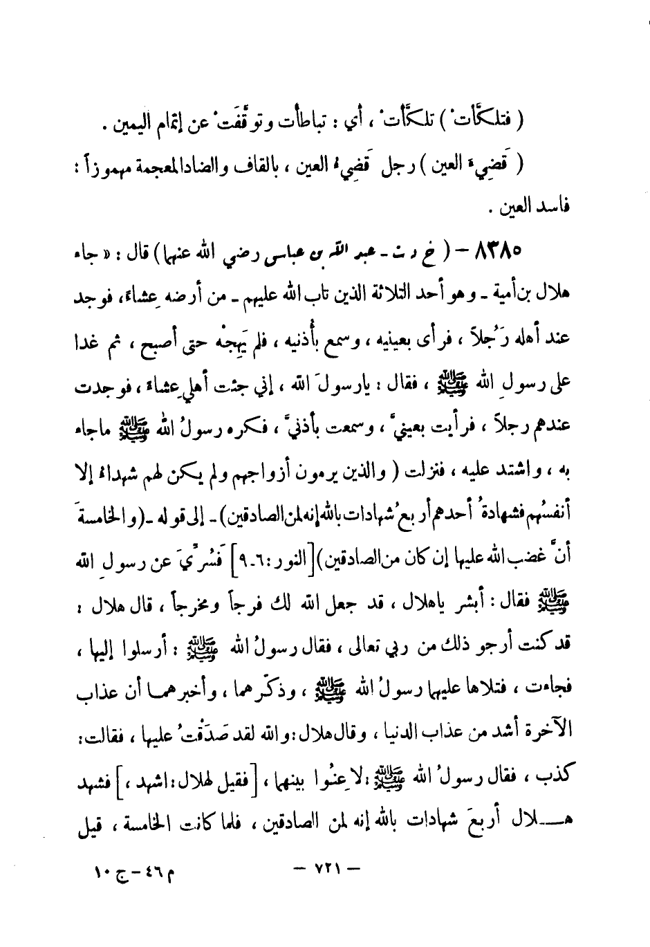 8385 - (خ د ت) عبد الله بن عباس - رضي الله عنهما - قال: «جاء هلال ابن أمية - وهو أحد الثلاثة الذين تاب الله عليهم - من أرضه عِشاء، فوجد عند أهله رَجُلاً، فرأى بعينيه، وسمع بأُذنيه، فلم يَهِجْه حتى أصبح، ثم غدا على رسولِ الله - صلى الله عليه وسلم-، فقال: يا رسولَ الله، إني جئت أهلي عِشاء، فوجدت عندهم رجلاً، فرأيت بعينيَّ، وسمعت بأذنيَّ، فكره رسولُ الله - صلى الله عليه وسلم- ما جاء به، واشتد عليه، فنزلت {والذين يرمون أزواجهم ولم يكن لهم شهداءُ إلا أنفسُهم فشهادةُ أحدهم أربعُ شهادات بالله إنه لمن الصادقين} - إلى قوله - {والخامسةَ أنَّ غضب الله عليها إن كان من الصادقين} [النور: 6 - 9] فَسُرِّيَ عن رسولِ الله - صلى الله عليه وسلم- فقال: أبشر يا هلال، قد جعل الله لك فرجاً ومخرجاً، قال هلال: قد كنت أرجو ذلك من ربي تعالى، فقال رسولُ الله - صلى الله عليه وسلم-: أرسلوا إليها، فجاءت، فتلاها عليهما رسولُ الله - صلى الله عليه وسلم-، وذكّرهما، وأخبرهما أن عذاب الآخرة أشد من عذاب الدنيا، وقال هلال: والله لقد صَدَقْتُ عليها، فقالت: كذب، فقال رسولُ الله - صلى الله عليه وسلم-: لاعِنُوا بينهما، [فقيل لهلال: اشهد] فشهد هلال أربعَ شهادات بالله إنه لمن الصادقين، فلما كانت الخامسة، قيل -[722]- له: يا هلال اتَّق الله، فإن عذاب الدنيا أهونُ من عذاب الآخرة، وإن هذه الموجبة التي توجب عليك العذاب، فقال: والله لا يعذِّبني الله عليها، كما لم يُجَلِّدْني عليها، فشهد الخامسة: أن لعنة الله عليه إن كان من الكاذبين، ثم قيل لها: اشهدي، فشهدت أربع شهادات بالله إنه لمن الكاذبين، فلما كانت الخامسة قيل لها: اتقي الله، فإن عذاب الدنيا أهْوَنُ من عذاب الآخرة، وإن هذه الموجبة التي توجب عليكِ العذاب، فتلكَّأتْ ساعة، ثم قالت: والله لا أفضح قومي، فشهدت الخامسة: أن غضب الله عليها إن كان من الصادقين، ففرَّق رسولُ الله - صلى الله عليه وسلم- بينهما، وقضى أن لا يُدْعَى ولدها لأبٍ، ولا تُرمَى، ولا يُرمَى ولدُها، ومَنْ رماها [أ] ورمى ولدها، فعليه الحدُّ، وقضى أن لا بيت عليه لها، ولا قُوتَ، من أجل أنهما يتفرَّقان من غير طلاق، ولا مُتَوفَّى عنها، وقال رسولُ الله - صلى الله عليه وسلم-: إن جاءت به أُصَيْهب، أُريصِح، أُثَيبِج، ناتئ الأليتين (¬1) حَمْشَ الساقين، فهو لهلال، وإن جاءت به أورقَ جَعْداً جُماليّاً، خَدَلَّجَ الساقين، سابغ الأليتين، فهو للذي رُمِيتْ به، فجاءت به أورقَ جعداً جُمالياً خدلّج الساقين، سابغ الأليتين، فقال رسولُ الله - صلى الله عليه وسلم-: لولا الأيْمان لكان لي ولها شأن، وقال عكرمة: فكان ولدُها بعد ذلك أميراً على مصر، وما يدعى لأبٍ» .
