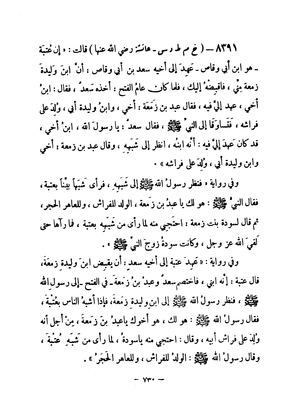 وفي رواية: «عَهِدَ عتبةُ إلى أخيه سعد: أن يقبِض ابنَ وليدةِ زمعَةَ، قال عتبة: إنَّه ابني، فاختصم سعدٌ وعبدُ بنُ زَمعةَ - في الفتح - إلى رسولِ الله - صلى الله عليه وسلم-، فنظر رسولُ الله - صلى الله عليه وسلم- إلى ابنِ وليدةِ زَمعةَ، فإذا أشبهُ الناس بعُتْبةَ، فقال رسولُ الله - صلى الله عليه وسلم-: هو لك، هو أخوك يا عبدُ بنَ زَمعةَ، مِنْ أجل أنه وُلِدَ على فراش أبيه، وقال: احتجبي منه يا سودةُ، لما رأى من شَبَهِ عُتْبةَ، وقال رسولُ الله - صلى الله عليه وسلم-: الولدُ للفراش، وللعاهر الحَجَرُ» . -[731]-