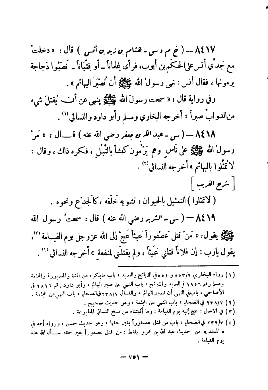 (¬1) رواه البخاري 9 / 553 و 554 في الذبائح والصيد، باب ما يكره من المثلة والمصبورة والمجثمة، ومسلم رقم (1956) في الصيد والذبائح، باب النهي عن صبر البهائم، وأبو داود رقم (2816) في الأضاحي، باب في النهي أن تصبر البهائم، والنسائي 7 / 238 في الضحايا، باب النهي عن المجثمة.