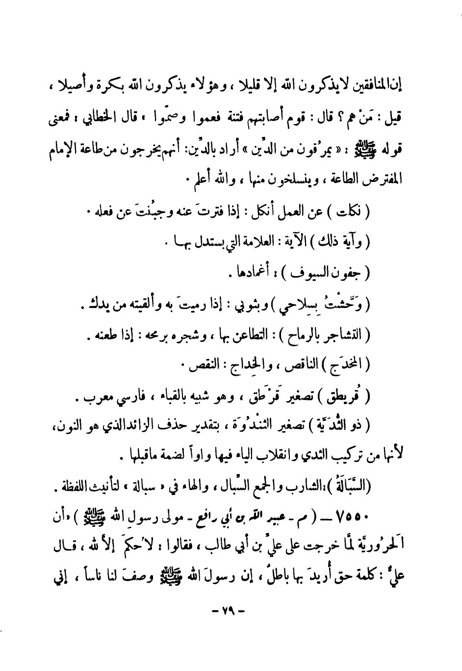 7550 - (م) عبيد الله بن أبي رافع - مولى رسولِ الله - صلى الله عليه وسلم- «أن الحَرُورَّية لمَّا خرجت على عليِّ بن أبي طالب، فقالوا: لا حُكمَ إلاَّ لله، قال عليّ: كلمة حق أُريدَ بها باطل، إن رسول الله - صلى الله عليه وسلم- وصفَ لنا ناساً، إني -[80]- لأعْرِفُ صفتهم في هؤلاءِ، يقولون الحقَّ بألسنتِهم، لا يجاوزُ هذا منهم - وأشار إلى حَلْقِهِ - مِن أبْغَضِ خلق الله إليه، منهم أسْودُ، في إحدى يديه طُبْيُ شَاة، أو حَلَمةُ ثدي، فلما قتلهم علي بن أبي طالب، قال: انظروا، فنظروا، فلم يجدوا شيئاً، فقال: ارجعوا، فوالله ما كذَبتُ ولا كُذِبتُ - مرتين أو ثلاثاً - ثم وجدوه في خَربة فأتَوا به، حتى وَضعُوهُ بين يَدِيْهِ، قال عبيد الله: وأنا حاضر ذلك من أمرهم وقولِ عليِّ فيهم» زاد في رواية: قال ابن حُنين: «رأيتُ ذلك الأسودَ» .