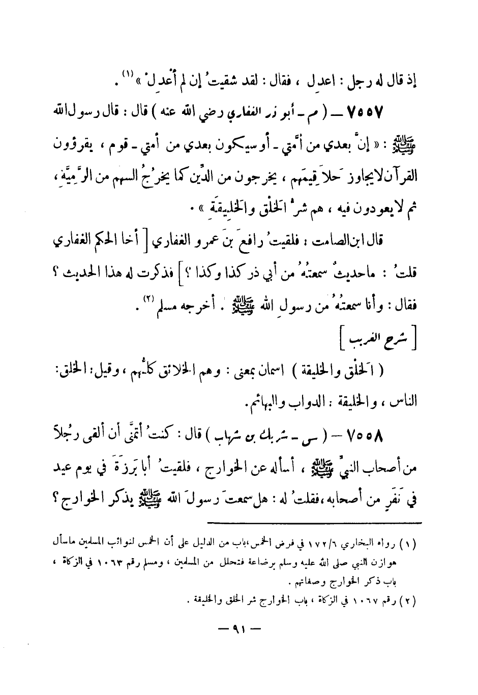 7557 - (م) - أبو ذر الغفاري - رضي الله عنه- قال: قال رسول الله - صلى الله عليه وسلم-: «إنَّ بعدي من أَمَّتى - أو سيكون بعدي من أُمتي - قوم، يقرؤون القرآن لا يجاوز حَلاقِيمَهم، يَخرجون من الدِّين كما يخُرجُ السهم من الرَّمِيَّةِ، ثم لا يعودون فيه، هم شَرُّ الخَلْق والخَلِيقَةِ» .