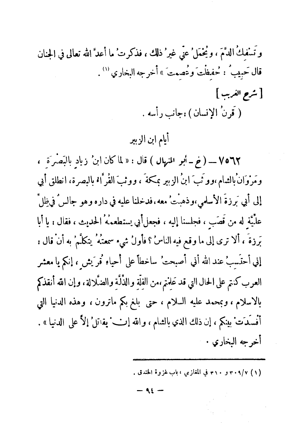 7562 - (خ) أبو المنهال قال: «لما كان ابنُ زياد بالبَصْرَةِ، ومَرْوَانُ بالشام، ووثَبَ ابنُ الزبير بمكةَ، ووثبَ القُرَّاءُ بالبصرة، انطلق أبي إلى أبي بَرزةَ الأسلمي، وذهبْتُ معه، فدخلنا عليه في داره وهو جالس في ظِلِّ علِّيَّة له من قَصَب، فجلسنا إليه، فجعل أبي يستطعمُهُ الحديث، فقال: يا أبا برَزةَ، ألا ترى إلى ما وقع فيه الناسُ؟ فأولُ شيء سمعتُهُ يتكلَّمُ به أنْ قال: إني أحتَسِبُ عند الله أني أصبحتُ ساخطاً على أحياءِ قُرَيش، إنكم يا معشر العرب كنتم على الحال التي قد عَلِمْتم، من القِلّة والذّلَّةِ والضَّلالة، وإن الله أنقذكم بالإسلام، وبمحمد عليه السلام، حتى بلغ بكم ما ترون، وهذه الدنيا التي أفْسَدَتْ بينكم، إن ذلك الذي بالشام، والله إنْ يقاتلُ إلاَّ على الدنيا» . أخرجه البخاري. -[95]-