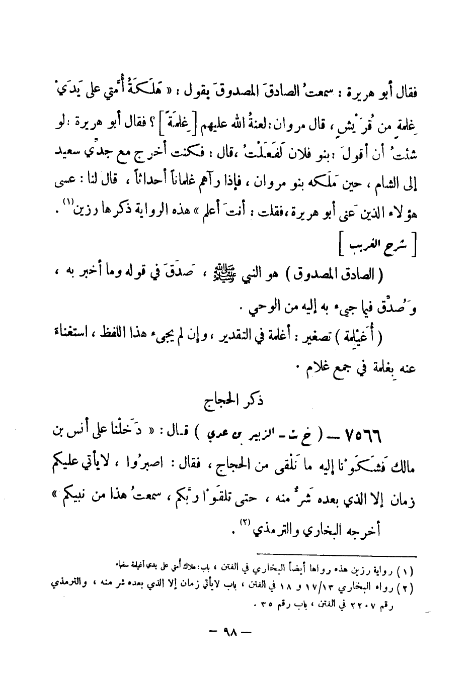 7566 - (خ ت) الزبير بن عدي قال: «دَخَلْنا على أنس بن مالك فَشَكَوْنا إليه ما نَلْقى من الحجاج، فقال: اصبرُوا، لا يأتي عليكم زمان إلا الذي بعده شَرّ منه، حتى تلقَوْا ربَّكم، سمعتُ هذا من نبيكم» أخرجه البخاري والترمذي (¬1) .