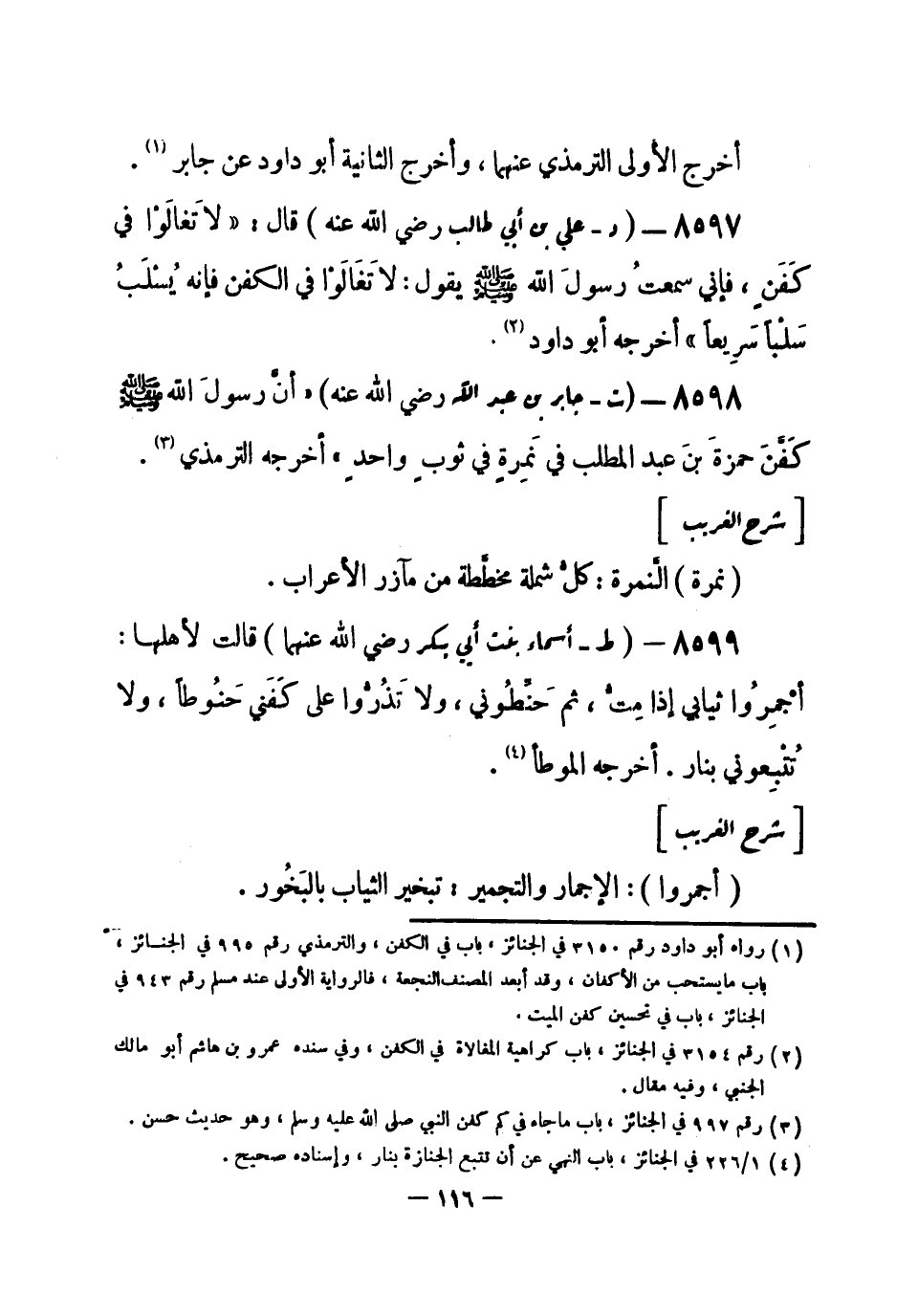 8598 - (ت) جابر بن عبد الله - رضي الله عنه - «أنَّ رسولَ الله - صلى الله عليه وسلم- كَفَّنَ حمزةَ بنَ عبد المطلب في نَمِرةٍ في ثوبٍ واحد» أخرجه الترمذي (¬1) .