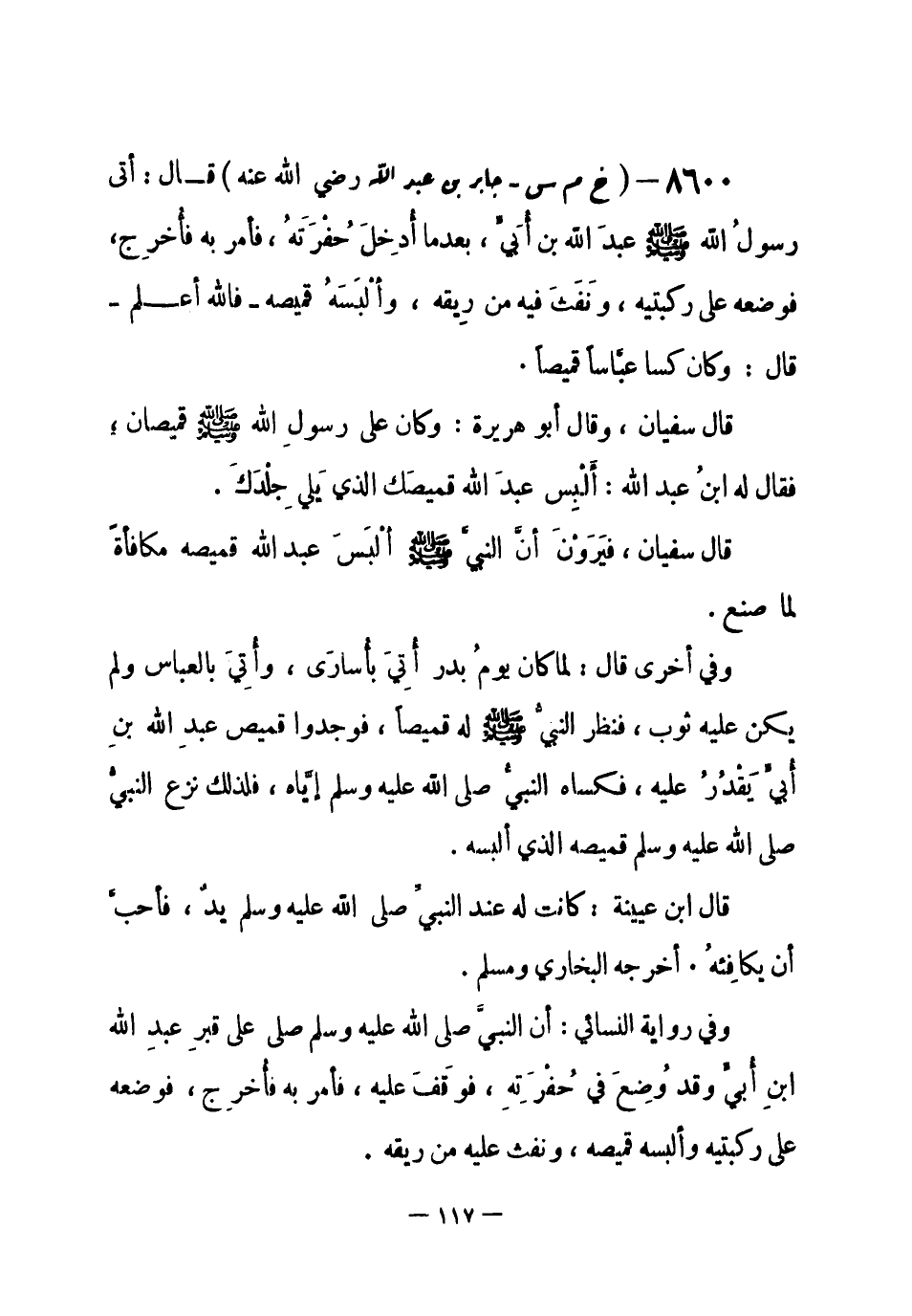 8600 - (خ م س) جابر بن عبد الله - رضي الله عنه - قال: «أتى رسولُ الله - صلى الله عليه وسلم- عبد الله بن أُبَيّ، بعدما أُدِخلَ حُفْرَتَهُ، فأمر به فأُخرِج، فوضعه على ركبتيه، ونَفَثَ فيه من رِيقه، وألْبَسَهُ قميصه - فالله أعلم - قال: وكان كسا عبَّاساً قميصاً» .