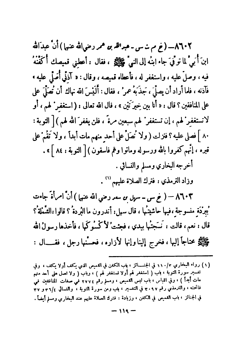 8602 - (خ م ت س) عبد الله بن عمر - رضي الله عنهما- «أنَّ عبد الله بنَ أُبيّ لما توفِّيَ جاء ابنُه إلى النبيِّ - صلى الله عليه وسلم-، فقال: أعطِني قميصك أُكَفِّنه فيه، وصلِّ عليه، واستغفر له، فأعطاه قميصه، وقال: «آذِنِّي أصلِّي عليه» فآذنه، فلما أراد أن يصلِّيَ، جَذَبَهُ عمرُ، فقال: أَلَيْسَ الله نهاك أن تُصِلِّي على المنافقين؟ قال: «أنا بين خِيرَتَيْن» ، قال الله تعالى: {استغفِرْ لهم أو لا تستغفِرْ لهم إن تستغفرْ لهم سبعين مرةً فلن يغفرَ الله لهم} [التوبة: 80] فصلى عليه، فنزلت {ولا تُصَلِّ على أحدٍ منهم مات أبداً ولا تَقُمْ على قبره إنَّهم كفروا باللَّه ورسوله وماتوا وهم فاسقون} [التوبة: 84] » .